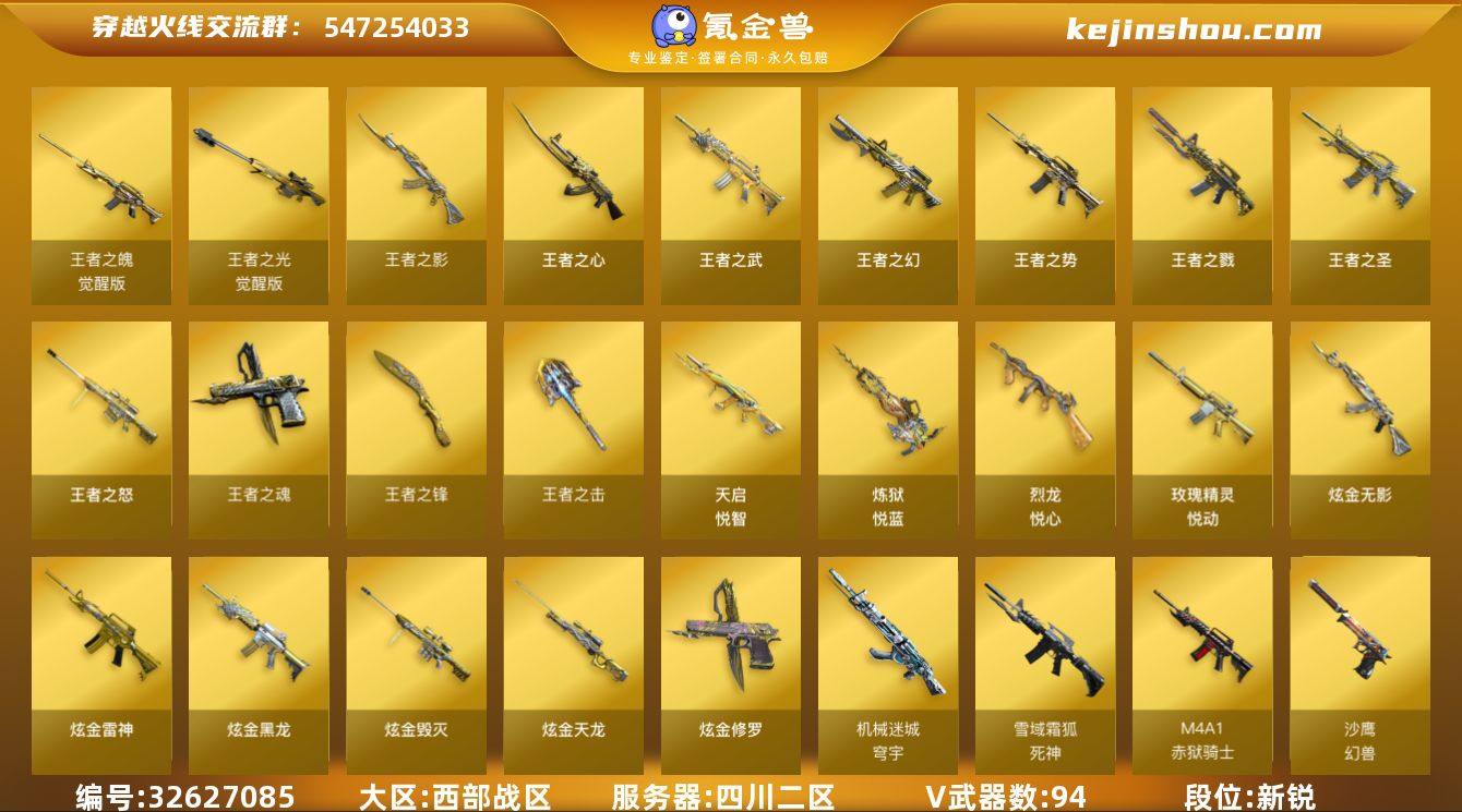 【ky6026】四川二区-102V-23王者武器数-9炫金武器数 【热门武器】:QBZ03-金色蔷薇*2,死亡之眼*2,Cat-刀锋,M4A1-黑骑士*2,汤姆逊-烈龙*8,RPK-盘龙,加特林-炼狱*3,沙鹰-修罗*7,高爆手雷-幻兽*3 【王者炫金武器】:王者之圣,王者之戮*2,天启-悦智,王者之幻,王者之势,王者之武,玫瑰精灵-悦动*2,王者之影,王者之心,王者之怒*2,炼狱-悦蓝*3,烈龙-悦心,王者之魂*2,王者之击,王者之锋,炫金无影,炫金黑龙*2,炫金雷神*3,炫金毁灭,炫金天龙,炫金修罗 【音效卡】:M4A1-黑骑士音效卡,Barrett-毁灭音效卡,死神-雪域霜狐-怀旧音效卡 【皮肤】:雷神-暗月,雷神-能量核心,雷神-宇航兔皮肤,毁灭-暗月,M4A1-千变-孔明皮肤,黑骑士-暗月*3,无影-暗月*2,AK47-B-常胜将军-曹操,天龙-秘银,极光-能量核心,修罗-能量核心 【角色】:零,葵,樱,瞳,魅影,审判者,王者-零,王者之瞳,王者沙漠玫瑰,狐影,雪域霜狐,乔伊教练,修道士,暗夜-X,初恋灵狐,风暴女,嘉年华灵狐,娟娟,兰-海滩派对,零-水下丽影,流浪蔷薇,龙儿-小淘气,麻雀,娜塔莉娅,潘多拉-X,潘多拉-甜心教官,青霞仙子,蛇姬,斯沃特-X,蜀雪,铁骑荣耀,兔囡囡,维纳斯,雪莉杨,雪莉...