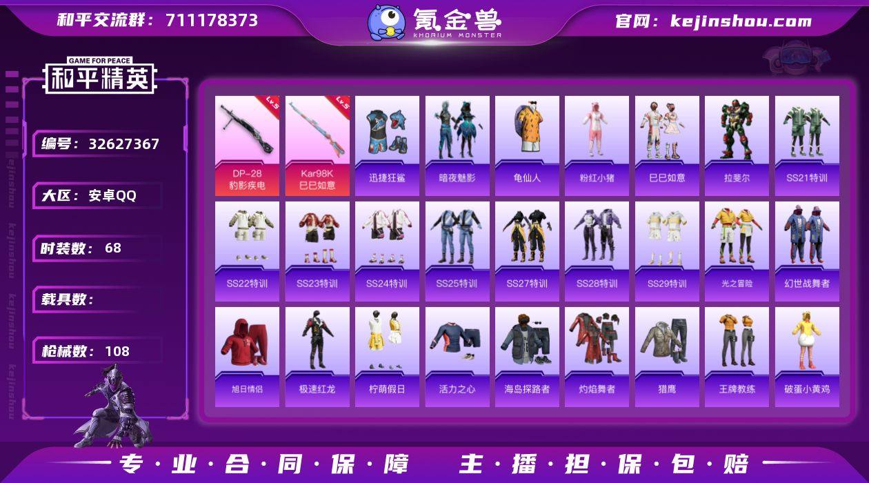 安卓,手Q-0粉装-4特效枪-0载具-1粉色飞行器-27292热力值-5王牌印记-68套装-108枪皮 【热门品类】:套装-龟仙人,套装-粉红小猪 【粉色枪皮等级】:UMP45-萌骑冒险(三级),Kar98K-巳巳如意(五级),Mk14-福马献瑞(五级),DP-28-豹影疾电(五级) 【粉色枪皮】:UMP45-萌骑冒险,Kar98K-巳巳如意,Mk14-福马献瑞,DP-28-豹影疾电 【粉色飞行器】:绝对恒星飞行器 【粉色降落伞】:第五大道降落伞,圣堂之誓降落伞,异瞳寒姬降落伞,炫彩糖果降落伞,罪夜之冕降落伞 【稀有套装】:套装-龟仙人,套装-巳巳如意,套装-雪国风尚,套装-马上来财,角色-拉斐尔 【稀有枪皮】:AKM-彩虹符号,AKM-影袭,AKM-破晓战魂,AKM-缤纷海域,M16A4-幻世战舞者,M16A4-红色方程式,SCAR-L-红色方程式,M416-糯团青竹,M416-红色方程式,GROZA-影袭,AUG-天降萌叽,AUG-耀粉歌者,QBZ-彩虹符号,M762-天降萌叽,Mk47-洛神天依,蜜獾-天降萌叽,蜜獾-绯穹魔姬,UZI-啾咪啾咪,UZI-天降萌叽,UZI-红色方程式,UMP45-蓝色火焰,Vector-生命誓言,Vector-创世·救赎,汤姆逊-天降萌叽,汤姆逊-耀粉歌者,P90-巳巳如意,Kar98K-彩虹符号,Kar98K-红色方程式,M24-炫彩节奏,SKS-炫彩节奏,SKS-糯团青竹,...
