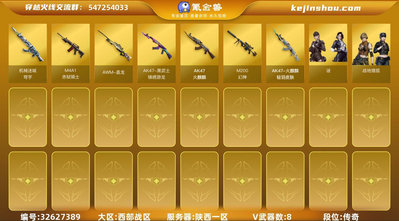 【ky6007】陕西一区-17V-7王者武器数-0炫金武器数 【热门武器】:M200-幻神 【皮肤】:火麒麟-轻羽皮肤 【角色】:谜,战地猎狐,电竞少女,飞虎队-X,风暴女,曼陀罗-X,夜玫瑰-宠粉 【人偶武器】:AWM-灵狐-15周年嘉年华,生化手雷-机甲核心 【暴走生化】:超级对讲机 【英雄级武器】:AK47-火麒麟,黑武士-锦绣游龙,HK417-朱雀-电竞之星,机械迷城-穹宇,M200-幻神,高爆手雷-雷霆王者-觉醒版*2,闪光弹-雷霆王者-觉醒版*3,烟雾弹-雷霆王者-觉醒版*2,M4A1-赤狱骑士,AWM-昌龙 【道具】:CFS限定背包,云山科技背包,超级背包,救世主-黑桃战神,绿色巨人,灵魂忍者*2,变异宝贝,迷雾幽灵*2,生化弹匣,夺命之镰,防化服*2,金色流光-枪王排位,星辰流光-枪王排位,流光-再燃火线,枪王排位28赛季金色流光,语音特效-生化,动感闪耀表情,EP战队名片,EP战队喷图,防弹头盔*2,防弹衣*2,C4工具钳*2,手雷包*2 【特殊枪械】: