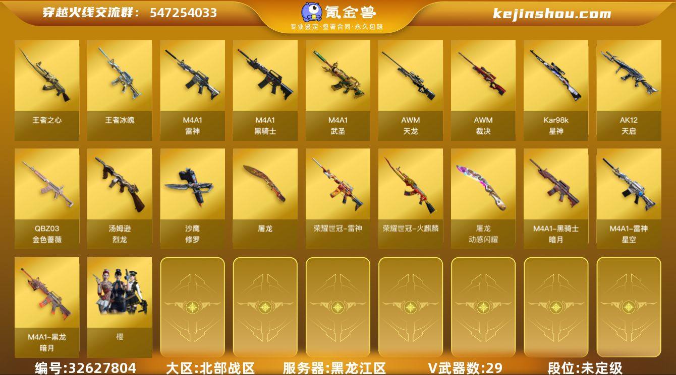 黑龙江区-31V-2王者武器数-0炫金武器数 【热门武器】:QBZ03-金色蔷薇*2,荣耀世冠-火麒麟,荣耀世冠-雷神,Kar98K-星神,M4A1-黑骑士,汤姆逊-烈龙,羊驼玩偶,沙鹰-修罗*5 【王者炫金武器】:王者冰魄,王者之心 【音效卡】:M4A1-雷神音效卡,M4A1-黑骑士音效卡,M4A1-苍鸣雷神音效卡,炼狱-百战金芒-庆典舞曲音效卡,死神-雪域霜狐-怀旧音效卡,柯尔特-百战金芒-庆典舞曲音效卡 【皮肤】:裁决-运输船 皮肤,雷神-星空,M4A1-再燃火线,黑龙-暗月*2,黑骑士-暗月,修罗-星空,屠龙-惊鸿 皮肤,轻型军用手斧-再燃火线 【角色】:樱,零·纪元,雪域霜狐,云海玲珑,葵-阿尔法武装,初恋灵狐,风暴女,娟娟,兰妹妹,龙儿,潘多拉-甜心教官,维纳斯,智影 【人偶武器】:迷你牛牛,迷你生化手雷,生化手雷-机甲核心 【英雄级武器】:M4A1-雷神*2,M4A1-黑骑士,AK12-天启,M4A1-武圣,死神-雪域霜狐,QBZ03-金色蔷薇*2,荣耀世冠-火麒麟,荣耀世冠-雷神,机械迷城-穹宇,AWM-天龙,AWM-裁决,Kar98K-星神,炼狱-百战金芒,汤姆逊-烈龙,沙鹰-修罗*5,柯尔特-百战金芒,屠龙,麒麟刺-百战金芒,手雷-云海游龙,M4A1-赤狱骑士,M4A1-苍鸣雷神 【道具】:BS战队炫彩背包,云山科...