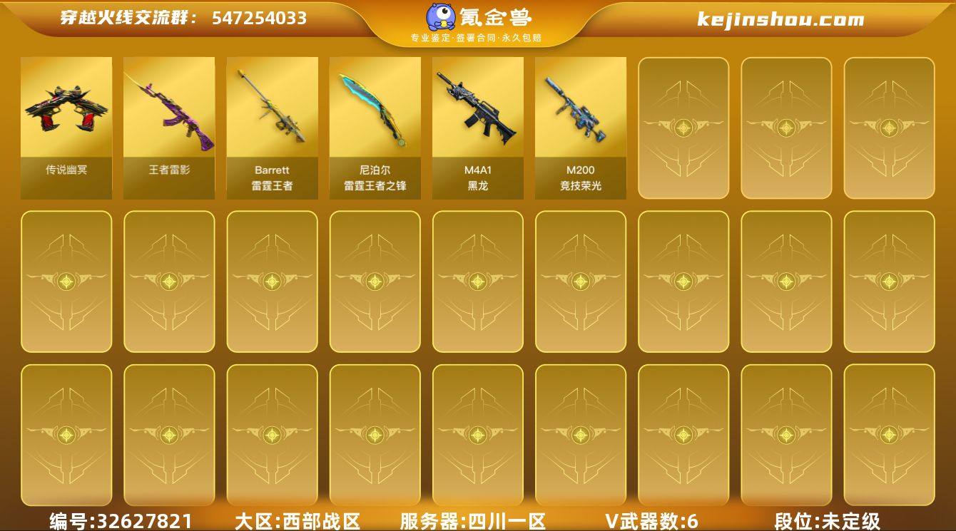 四川一区-12V-10王者武器数-0炫金武器数 【传说武器】:传说幽冥 【热门武器】:传说幽冥,M200-竞技荣光 【王者炫金武器】:王者雷影,Barrett-雷霆王者*2,雷霆王者之锋 【皮肤】:幻影-破浪逐光 皮肤 【角色】:北极狐-X,风暴女,娟娟,灵狐者-X,斯沃特-X 【人偶武器】:生化手雷-机甲核心 【英雄级武器】:M4A1-黑龙,M200-竞技荣光,高爆手雷-竞技荣光,高爆手雷-雷霆王者-觉醒版*2,闪光弹-竞技荣光,闪光弹-雷霆王者-觉醒版*3,烟雾弹-雷霆王者-觉醒版 【道具】:炫彩背包,绿色巨人,灵魂忍者,迷雾幽灵,夺命之镰,防化服*3,枪王排位28赛季金色流光,枪王排位29赛季金色流光,防弹头盔*3,防弹衣*3,C4工具钳*3,手雷包*3 【特殊枪械】: