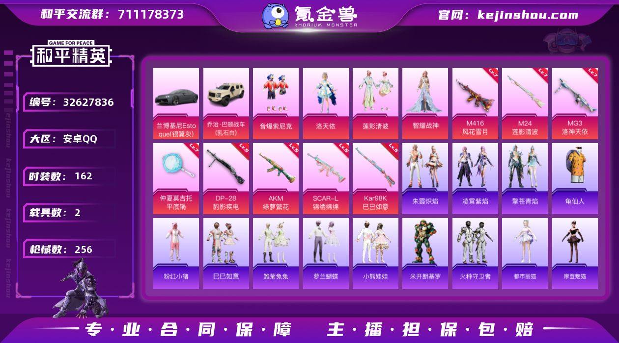 安卓 手Q-4粉装-8特效枪-2载具-1粉色飞行器-80003热力值-11王牌印记-162套装-256枪皮 【热门品类】:粉装-音爆索尼克,套装-龟仙人,套装-粉红小猪 【粉色套装】:角色-洛天依,粉装-音爆索尼克,粉装-莲影清波,角色-智耀战神 【粉色枪皮等级】:AKM-绿萝繁花(五级),SCAR-L-锦绣绵绵(五级),M416-风花雪月(七级),Kar98K-巳巳如意(五级),M24-莲影清波(七级),DP-28-豹影疾电(五级),MG3-洛神天依(七级),平底锅-仲夏莫吉托(七级) 【粉色载具】:兰博基尼Estoque(银翼灰),乔治巴顿战车(乳石白) 【粉色枪皮】:AKM-绿萝繁花,SCAR-L-锦绣绵绵,M416-风花雪月,Kar98K-巳巳如意,M24-莲影清波,DP-28-豹影疾电,MG3-洛神天依,平底锅-仲夏莫吉托 【粉色飞行器】:灵猫魔法师飞行器 【粉色降落伞】:洛神天依降落伞,环太平洋降落伞,千面幻镜降落伞,暗夜鎏金降落伞,第五大道降落伞,未来歌姬降落伞,炫光之旅降落伞,精灵梦叶罗丽降落伞,盛世惊鸿降落伞,星穹咏叹调降落伞,冷漠罗丽降落伞,异瞳寒姬降落伞,炫彩糖果降落伞 【稀有套装】:套装-龟仙人,套装-巳巳如意,套装-雏菊兔兔,套装-萝兰蝴蝶,套装-小熊娃娃,角色-米开朗基罗,套装-火种守卫者,角色-都市丽...
