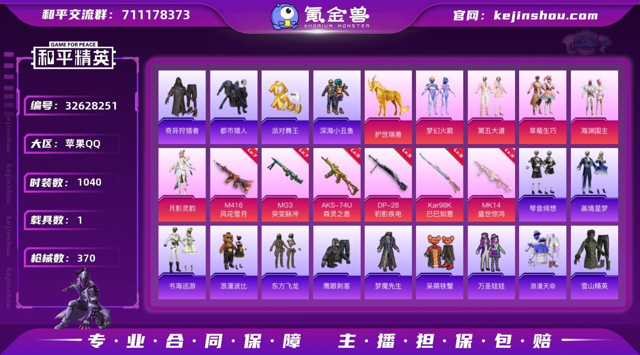 【特价出售】苹果Q-5稀有1载具5粉装8特效枪25热门273套装370枪皮 114159热力值 17印记 历史卓越王牌24星 【5稀有】 奇异狩猎者 都市猎人 浪漫天命 派对舞王 派对舞王(金靴子) 【1载具】 护世瑞兽 【5粉装】 梦幻火箭 月影灵韵 第五大道 草莓生巧 海渊国主 【8特效枪】 AKS-74U-森灵之息 (5级) Kar98K-巳巳如意 (5级) MG3-突变脉冲 (7级) DP-28-豹影疾电 (5级) Mk14-盛世惊鸿 (3级) M416-风花雪月 (7级) Mk14-福马献瑞 (5级) ACE32-萌骑漫游 (4级) 【25热门】 浪漫假日 雪山精英 东方飞龙 晶辉守护 梦魇先生 呆萌铁蟹 万圣娃娃 鹰眼刺客 深海小丑鱼 浪漫波比 醒狮腾龙 团圆交子 瑞龙福将 豚鼠丹丹 漫步者 海洋之心 破蛋小黄鸡 风华少年志 白月香洋装 新侠客行 黑色刀锋 极速红龙 M762-奇异狩猎者 M762-瑞龙福将 M24-香水柠檬 【3飞行器】 齐天大圣飞行器 风花雪月飞行器 天之羽翼飞行器 【3头盔】 童趣迷兔头盔 梦幻火箭头盔 金曜白虎头盔 【6背包】 梦幻火箭背包 深海小丑鱼背包 神秘黑猫背包 古堡领主背包 马卡龙背包 夏日绵绵冰背包