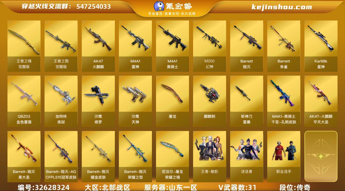 山东一区-36V-2王者武器数-0炫金武器数 【热门武器】:QBZ03-金色蔷薇,M200-幻神,Kar98K-星神,M4A1-黑骑士,加特林-炼狱,斯泰尔-蝴蝶,USP-雷暴,沙鹰-修罗 【皮肤】:雷神-荣耀之魄,火麒麟-平天大圣,毁灭-荣耀之怒,毁灭耀金皮肤,毁灭-AG-CFPLS15冠军,毁灭-黑大圣皮肤,M4A1-千变-孔明皮肤,屠龙-荣耀之锋 【角色】:迷迭香,王者-魅影,暗夜-X,北极狐-X,初恋灵狐,芳心审判者,虎妞,灵狐者-X,灵狐者-黄金海岸,龙儿-小淘气,潘多拉-X,蜀雪,铁骑荣耀,职业选手 【人偶武器】:斯泰尔-蝴蝶,迷你牛魔王 【挑战大师】:神圣爆裂者III 【英雄级武器】:AK47-火麒麟,M4A1-雷神,M4A1-黑骑士,QBZ03-金色蔷薇,王者之戮-觉醒版,Barrett-毁灭,M200-幻神,Barrett-朱雀,Kar98K-星神,加特林-炼狱,沙鹰-修罗,沙鹰-天神*2,USP-雷暴,屠龙,麒麟刺*3,斩神刀-雷暴,王者之锋-觉醒版,高爆手雷-雷暴*4,闪光弹-雷暴*4,烟雾弹-雷暴*4,烟雾弹-荣耀世冠EP 【源级武器】:源-千变,魂·火麒麟-百城,魂·雷神-新春神龙,御·雷神-烈虎,御·雷神-小白龙,魂·龙血-锋芒破茧,魂·QBZ03-金色蔷薇-萌杀,源·天龙,魂·毁灭-青帝,御·毁灭-葫芦兄弟,御·毁灭-怒火大圣,魂·Barr...