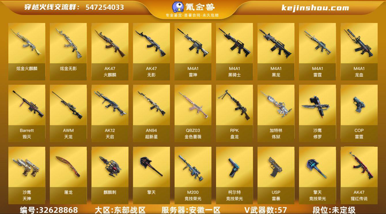 安徽一区-59V-6王者-3炫金 【热门武器】:QBZ03-金色蔷薇,M200-竞技荣光,M4A1-黑骑士,RPK-盘龙*6,加特林-炼狱,USP-雷暴,沙鹰-修罗 【王者炫金武器】:炫金火麒麟,炫金无影*2 【音效卡】:Barrett-毁灭音效卡 【皮肤】:雷神-星空,火麒麟-盘古,毁灭-秦师 皮肤,毁灭-英雄计划 皮肤,黑龙-能量核心,M4A1-黑龙-361,无影耀金皮肤,极光-能量核心 【角色】:炫,电竞教官-云悠悠,王者葵-惊若翩鸿,空,风暴女,兰-海滩派对,潘多拉-甜心教官,铁骑荣耀 【人偶武器】:M37-葵 【暴走生化】:超级对讲机 【挑战大师】:试炼破坏者III,阐释者III 【英雄级武器】:AK47-火麒麟,M4A1-黑龙,M4A1-雷神,M4A1-黑骑士,AK47-无影,AK12-天启,AN94-超新星,M4A1-龙血,M4A1-雷霆,QBZ03-独角-V,QBZ03-金色蔷薇,王者之魄-觉醒版,AK-47-猩红传说,王者之烈-觉醒版,AWM-天龙*2,Barrett-毁灭,M200-竞技荣光,RPK-盘龙*6,加特林-炼狱,悦蓝-惊涛骇浪-觉醒版,沙鹰-修罗,沙鹰-天神,USP-雷暴,雷霆之契,柯尔特-竞技荣光,屠龙,擎天*2,麒麟刺*2,擎天-竞技荣光,高爆手雷-雷霆*6,高爆手雷-竞技荣光,闪光弹-雷霆*6,闪光弹-竞技荣光,烟雾弹-雷霆*6,烟雾弹-竞技荣光 【...