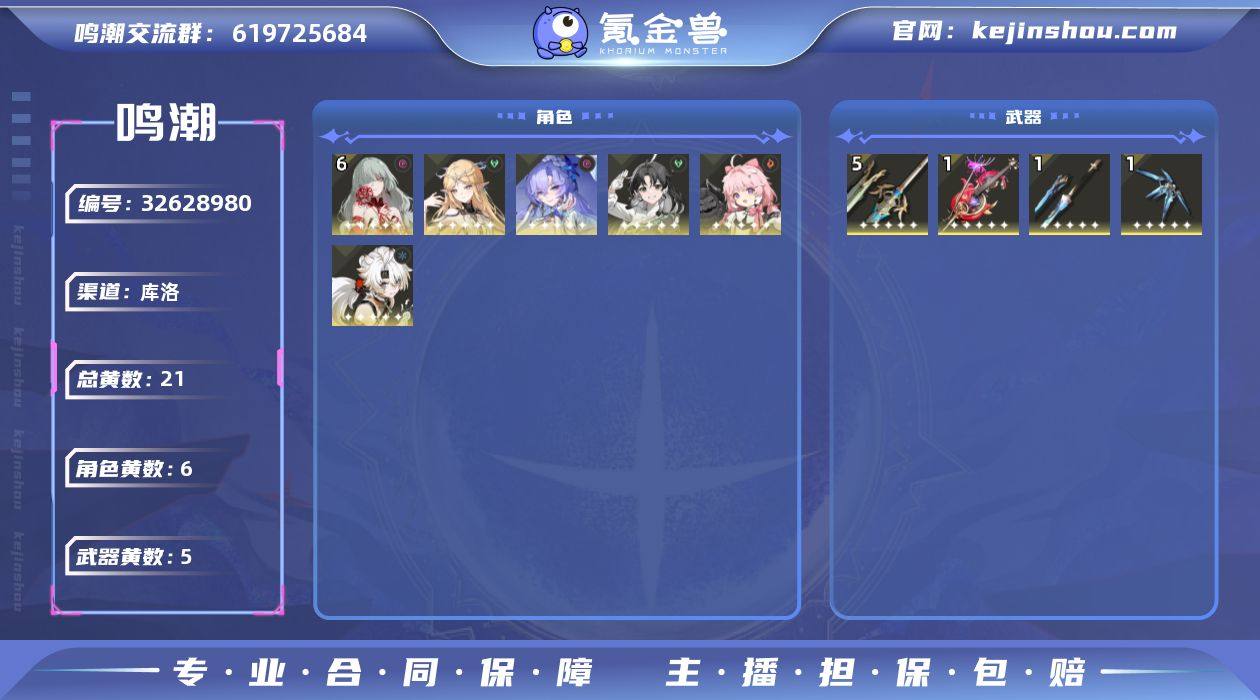 男/女主: 男主 总黄数: 21 联觉等级: 67 拥有五星共鸣者: 鉴心,安可,凌阳,坎特蕾拉,卡提希娅,弗洛洛 6鸣五星共鸣者: 6鸣弗洛洛 0鸣五星共鸣者: 0鸣鉴心,0鸣安可,0鸣凌阳,0鸣坎特蕾拉,0鸣卡提希娅 拥有五星武器: 千古洑流,漪澜浮录,血誓盟约,幽冥的忘忧章 5鸣五星武器: 5鸣血誓盟约 1鸣五星武器: 1鸣千古洑流,1鸣漪澜浮录,1鸣幽冥的忘忧章 亮点: 【MC117】67级/21黄/男主/6个五星角色/5个五星武器未绑定,弗洛洛,卡提希娅,坎特蕾拉,鉴心,安可,凌阳,幽冥的忘忧章,血誓盟约,千古洑流,漪澜浮录,满命弗洛洛,0命卡提希娅,0命坎特蕾拉,0命鉴心,0命安可,0命凌阳,精5血誓盟约,精1幽冥的忘忧章,精1千古洑流,精1漪澜浮录