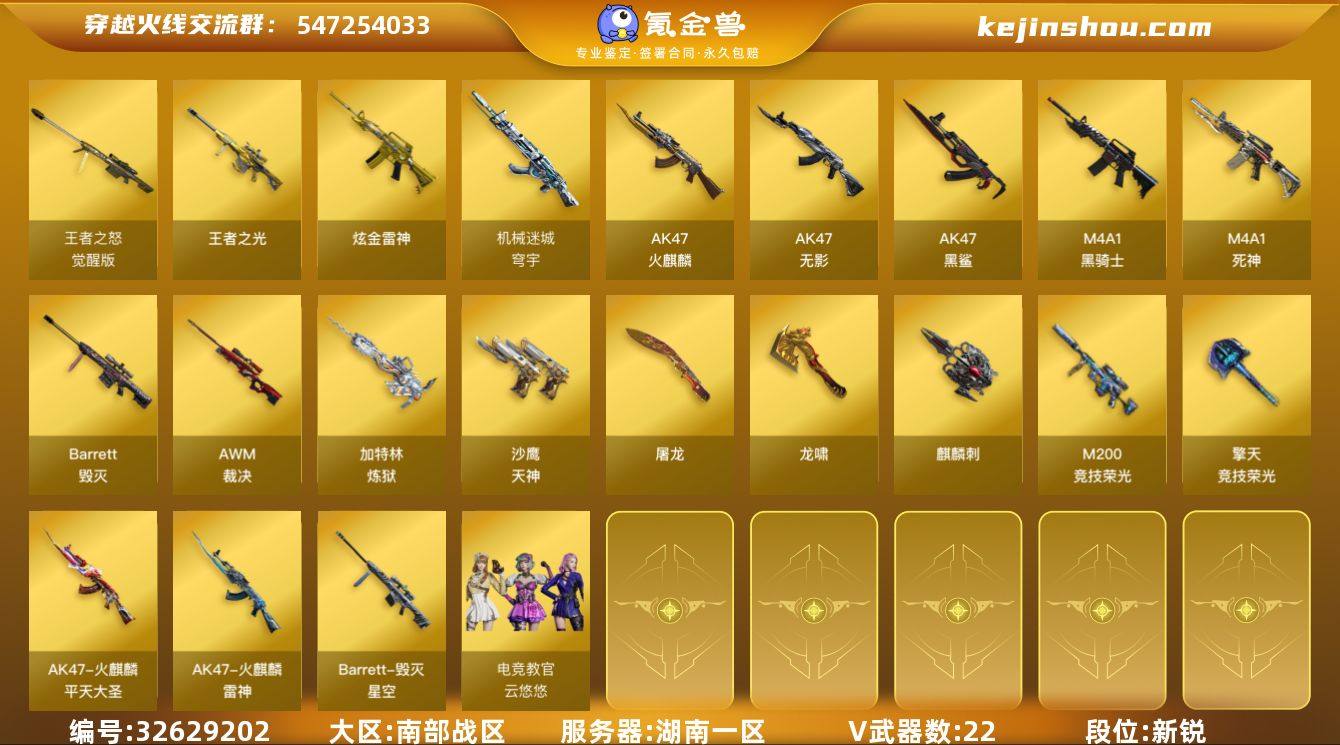 湖南一区-25V-3王者武器数-1炫金武器数 【热门武器】:M200-竞技荣光,死亡之眼,C.A.T,M4A1-黑骑士,加特林-炼狱*2,USP-雷暴 【王者炫金武器】:王者之光,炫金雷神 【皮肤】:火麒麟-雷神,火麒麟-平天大圣,毁灭-星空 【角色】:电竞教官-云悠悠,奇洋探员,嘉年华灵狐,葵-赛博朋克,潜龙队-X,影武者-X 【人偶武器】:AWM-灵狐-15周年嘉年华,C.A.T,迷你裂空之翼*3 【暴走生化】:死亡之眼 【挑战大师】:暴君乱世-超越Max,冰龙粉碎者-白马银枪,VEPR-12-金魔,激光毁灭者III,阐释者III 【英雄级武器】:AK47-火麒麟,M4A1-黑骑士,AK47-无影,M4A1-死神,AK47-黑鲨,超新星-悦享-觉醒版,机械迷城-穹宇,Barrett-毁灭,AWM-裁决,M200-竞技荣光,Barrett-金色蔷薇,王者之怒-觉醒版,加特林-炼狱*2,沙鹰-天神,USP-雷暴,屠龙,龙啸,麒麟刺,擎天-竞技荣光,高爆手雷-竞技荣光,闪光弹-竞技荣光*2,烟雾弹-竞技荣光 【源级武器】:源-千变,源·火麒麟,魂·火麒麟-百城,火麒麟-雷神,源-黑龙,源·雷神*3,魂·M4A1-雷神-化蛇,魂·雷神-新春神龙,魂·雷神-15周年嘉年华,御·雷神-机甲刑天,雷神-赛博幻想,雷神-赛博朋克,魂·黑骑士-摸金校尉,魂·黑骑士-现代金属...