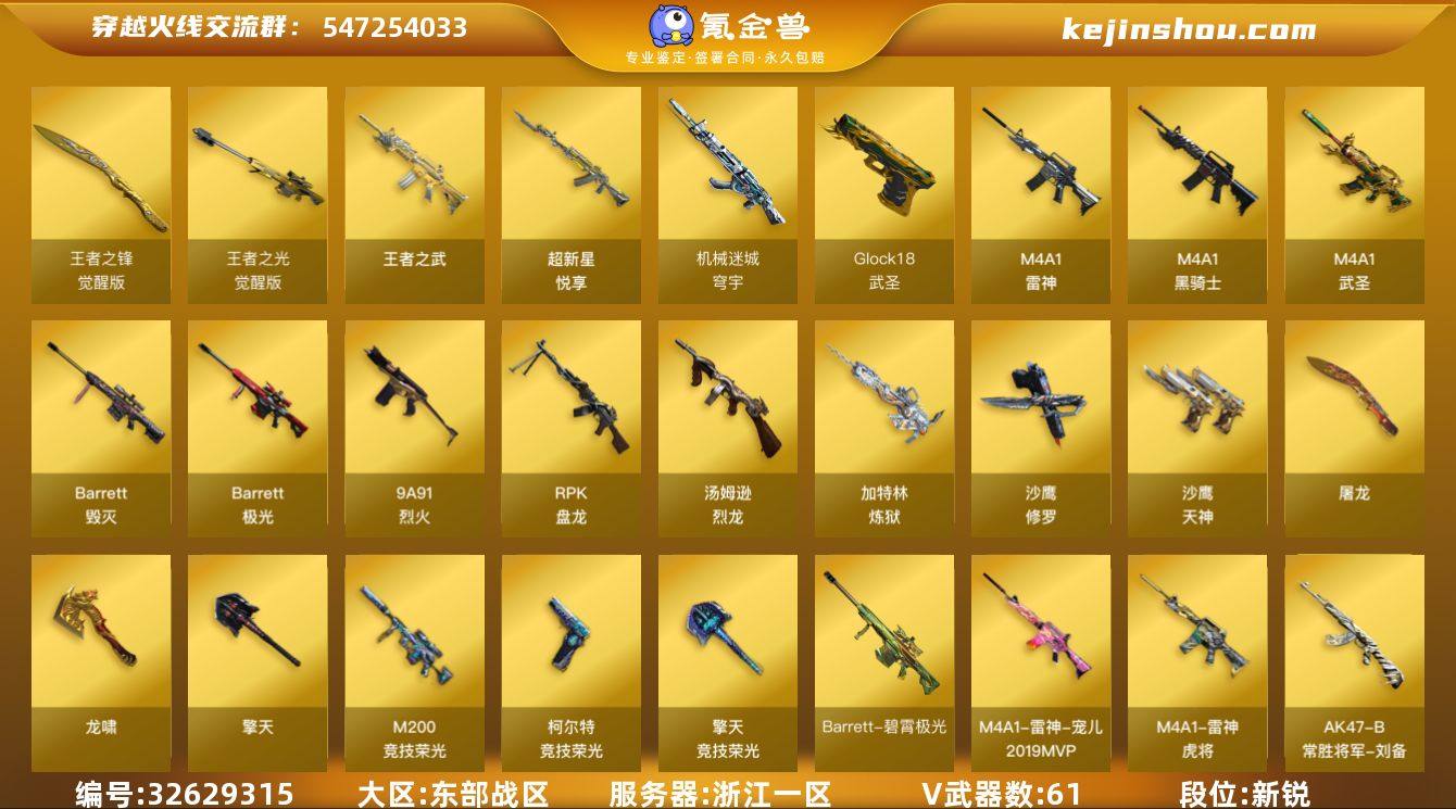 浙江一区-72V-5王者武器数-0炫金武器数 【热门武器】:M200-竞技荣光,死亡之眼,毒蜂,M4A1-黑骑士*2,汤姆逊-烈龙*6,RPK-盘龙*8,加特林-炼狱*2,裁决-雪莉杨,USP-雷暴,沙鹰-修罗*5 【王者炫金武器】:超新星-悦享,王者之武 【音效卡】:Barrett-极光音效卡 【皮肤】:金色蔷薇-电竞之星 皮肤,烈龙-星空,雷神-虎将,雷神-宠儿-2019MVP,雷神-源计划2.0专属 皮肤,毁灭-魔灵皮肤,毁灭-英雄计划 皮肤,AK47-B-常胜将军-刘备,极光-能量核心,炼狱-星空 【角色】:葵,瞳,电竞教官-云悠悠,妮妮,零·纪元,雪域霜狐,幻面灵狐,初恋灵狐,嘉年华灵狐,兰-海滩派对,流浪蔷薇,潘多拉-X,铁骑荣耀,兔囡囡,维纳斯,新娜塔莎,雪莉杨,樱-战斗天使,影武者-X,智影 【人偶武器】:裁决-雪莉杨,M4A1-雷神-精英刀锋,AWM-灵狐-15周年嘉年华,迷你牛牛,迷你生化手雷*3,生化手雷-机甲核心*3 【暴走生化】:毒蜂,异变清道夫,黑龙吞噬者,双面神,死亡之眼,超级对讲机 【挑战大师】:激光毁灭者III 【英雄级武器】:M4A1-雷神*2,M4A1-黑骑士*2,M4A1-武圣,9A91-烈火*2,HK417-朱雀-电竞之星,机械迷城-穹宇,Barrett-毁灭*2,Barrett-极光*3,M200-竞技荣光,Barrett-...