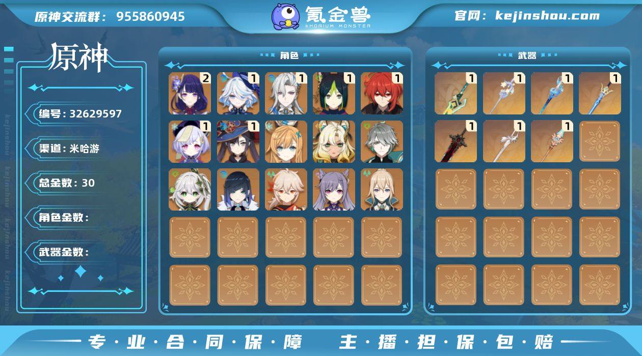 邮箱: 未绑定 总黄数: 30 冒险等级: 58 2命金色角色: 二命雷电将军 1命金色角色: 一命迪卢克,一命七七,一命莫娜,一命提纳里,一命那维莱特,一命芙宁娜 0命金色角色: 枫原万叶,刻晴,琴,夜兰,纳西妲,艾尔海森,希诺宁,爱可菲 1精武器: 狼的末路,风鹰剑,天空之脊,苍古自由之誓,静水流涌之辉,柔灯挽歌,山王长牙