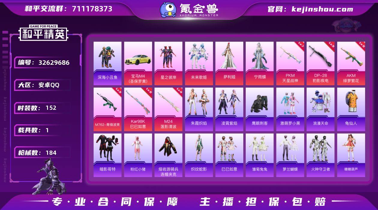 安卓 手Q-4粉装-9特效枪-1载具-0粉色飞行器-56309热力值-11王牌印记-152套装-184枪皮 【热门品类】:套装-浪漫天命,套装-深海小丑鱼,套装-龟仙人,套装-暗影哥特,套装-粉红小猪,熔岩游骑兵连帽夹克 【粉色套装】:粉装-星之彼岸,粉装-未来歌姬,角色-萨利娅,角色-宁雨蝶 【粉色枪皮等级】:AKM-绿萝繁花(五级),M762-青锋波束(五级),ACE32-萌骑漫游(四级),AKS-74U-森灵之息(五级),Kar98K-巳巳如意(五级),M24-莲影清波(四级),Mk14-福马献瑞(五级),DP-28-豹影疾电(五级),PKM-天星战神(七级) 【粉色载具】:宝马M4(圣保罗黄) 【粉色枪皮】:AKM-绿萝繁花,M762-青锋波束,ACE32-萌骑漫游,AKS-74U-森灵之息,Kar98K-巳巳如意,M24-莲影清波,Mk14-福马献瑞,DP-28-豹影疾电,PKM-天星战神 【粉色降落伞】:第五大道降落伞,飒粉甜心降落伞,闲梦青缨降落伞,鬼刀降落伞,星穹咏叹调降落伞,灵猫魔法师降落伞,异瞳寒姬降落伞,炫彩糖果降落伞,辉光之愿降落伞 【稀有套装】:套装-龟仙人,套装-炽纹蛇影,套装-巳巳如意,套装-雪国风尚,套装-马上有钱,套装-雏菊兔兔,套装-萝兰蝴蝶,套装-火种守卫者,套装-糖糖葫芦,套装-青团波波,套装-棉花软糖,套装-燕燕...