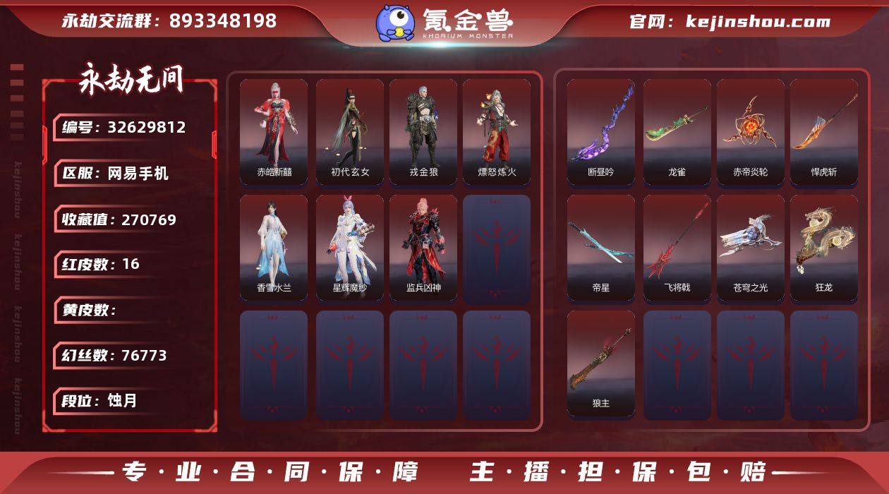WJ5594,网易手机,4月21可换绑,三人段位蚀月3,16红,432金,声望8,等级383,收藏值270769,,幻丝76773,金砖314,通行证Lv65,变身器,雪霜姿,凶虎,揽九天,镇冥司,竹韵悠,珥冰,御祥云,荆魂,应龙号,红色神品,香雪水兰,监兵凶神,星辉魔纱,戎金狼,赤皓新囍,初代玄女,熛怒炼火,苍穹之光,赤帝炎轮,龙雀,狼主,悍虎斩,飞将戟,狂龙,断昼吟,帝星,角色金色皮肤,寒烟素,麟鹿大铠,花之倾奇,凛冬,瀚海苍鹰,不败擂主,冬无归,炽火照夜,代号丝莼,秋藏桂,P5R奥村春NOIR,悠竹萌客,涂鸦少女,天道,幽夜玲珑,羞花,春不敛,赤阳天狐,日影花阴,念奴娇,寿竹云春,云间影,山漠狞影,极光夏夜,日月明,如梦令,斩神林七夜,雷行猎手,墨游痕,砥砺筋骨静控,觉明尊者,白熊,九骊之君,八宝龙王,鹅黄纱梦,路奇迷踪,多闻天王,追猎,昆仑之主,康复之星,李星云,鹧鸪天,精武魂,游四海,紫藤神子,洛天依星空投影,紫金玉女,碧水青天,昆仑圣女,御宅罗梦,阴阳姬,贵胄少女,暗夜利刃,妖刀姬,汐泪,精卫,鸢纱,无拘,铁面,复制体尼尔,斩魔天将,百战破荆者,汉光,过江龙,翠影,百战惊锋,镇恶天下第一蓄转振,甜心震荡,毛乎乎,无韵...