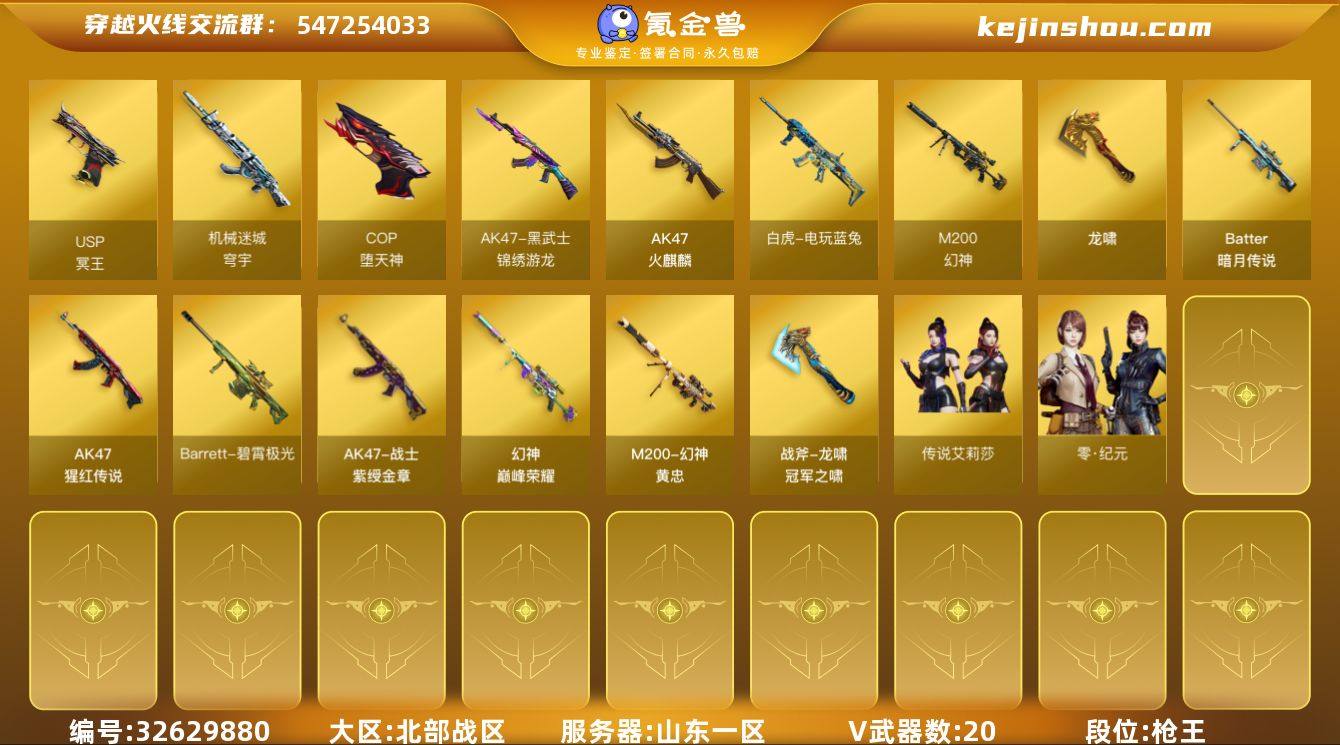 山东一区-23V-4王者武器数-0炫金武器数 【传说角色】:传说艾莉莎 【热门武器】:M200-幻神,白虎-电玩蓝兔,COP-堕天神 【皮肤】:M200-幻神-黄忠皮肤,幻神-巅峰荣耀,战神-紫绶金章皮肤*3,龙啸-冠军之啸 【角色】:智,零·纪元,乔伊教练,修道士,风暴女,嘉年华灵狐,娟娟,潘多拉-甜心教官,斯沃特-X,兔囡囡,雪莉杨-摸金校尉 【人偶武器】:天龙-曼陀罗,雷神-研,AWM-灵狐-15周年嘉年华,生化手雷-机甲核心,迷你超能女侍,灵狐娃娃手雷 【英雄级武器】:AK47-火麒麟,黑武士-锦绣游龙,AK-47-猩红传说,白虎-电玩蓝兔,机械迷城-穹宇,M200-幻神,Kar98K-量子之心,Barrett-暗月传说,COP-堕天神,Anaconda-量子之心,USP-冥王,龙啸,扳手-量子之心,高爆手雷-量子之心*2,闪光弹-量子之心*2,烟雾弹-量子之心*2,AK47-竞魂无影,Barrett-碧霄极光 【源级武器】:御·火麒麟-平天大圣,源·雷神*2,魂·M4A1-雷神-化蛇,魂·雷神-神秘按键,魂·雷神-15周年嘉年华,雷神-赛博幻想,魂·黑骑士-现代金属,御·黑骑士·哪吒闹海,源·武圣,源·机械迷城,魂·龙血-锋芒破茧,源-金色蔷薇,魂·QBZ03-金色蔷薇-萌杀,源·玫瑰精灵,魂·英雄-湾区光枢,源·天龙,魂·天龙-彼岸花,...