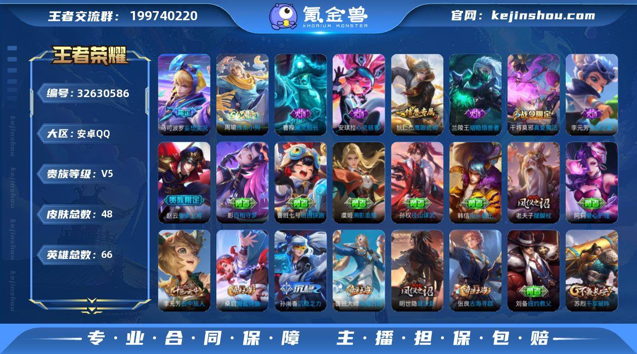 【特价v5号·银标马可波罗·9000战力马克·射手号】安卓Q-V5-最强王者段位-66英雄-47皮肤-1传说-7史诗 【英雄全皮】:孙权全皮 【传说皮肤】:马可波罗妄想实况 【限定皮肤】:狄仁杰阴阳师,赵云皇家上将,墨子神迹守卫,马可波罗妄想实况,达摩沙漠行僧,项羽海滩派对,老夫子醍醐杖,亚瑟潮玩骑士王,后羿圣弓游侠,李元芳云中旅人,钟馗驱傩正仪,干将莫邪真爱魔法,鬼谷子原初探秘者,苏烈千军破阵,明世隐疑决卦,猪八戒西部大镖客,鲁班大师探海日志,桑启海盐诗旅,张良古海寻踪 【赛季限定】:明世隐疑决卦,老夫子醍醐杖,鬼谷子原初探秘者,钟馗驱傩正仪,苏烈千军破阵,达摩沙漠行僧,李元芳云中旅人,桑启海盐诗旅,鲁班大师探海日志,张良古海寻踪 【战令限定】:猪八戒西部大镖客,亚瑟潮玩骑士王,墨子神迹守卫,干将莫邪真爱魔法,后羿圣弓游侠,周瑜线条小狗 【史诗皮肤】:周瑜线条小狗,干将莫邪真爱魔法,狄仁杰鹰眼统帅,李元芳逐浪之夏,安琪拉心灵骇客,兰陵王暗隐猎兽者,曹操幽灵船长,赵云皇家上将 【其他皮肤】:鲁班七号班班快跑,虞姬溯影追猎,孙权径山谋武,张良古海寻踪,鲁班大师探海日志,桑启海盐诗旅,李元芳云中旅人,达摩沙漠行僧,后羿...