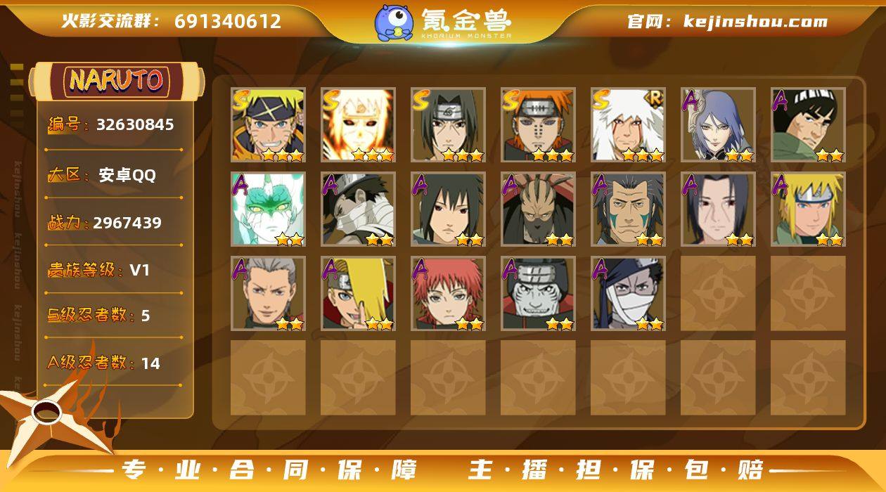5S忍/14A忍/战力296W/V1/区服4327 【S忍者】 宇智波佐助「漩涡鸣人」,自来也「舞之豪杰」,宇智波鼬「须佐能乎」,佩恩「天道」,波风水门「九喇嘛连结」, 【A忍者】 小南「神驹佑将」,巳月「仙人模式」,迈特凯「青春爆炸」,宇智波鼬「夏日限定」,不动,蝎「绯流琥」,宇智波泉奈,桃地再不斩「秽土转生」,波风水门「青年」,飞段,迪达拉,蝎,干柿鬼鲛,桃地再不斩, PX_2519941