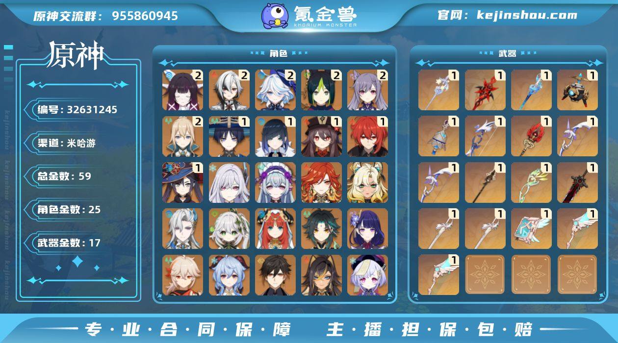 角色40金,武器17金,(2命哥伦比亚,2命阿蕾奇诺,2命芙宁娜,2命提纳里,2命琴,2命刻晴,1命夜兰,1命流浪者,1命胡桃,1命莫娜,0命丝柯克,0命马薇卡,0命希诺宁,0命月瑞希,0命那维莱特,0命迪希雅,0命纳西坦,0命妮露,0命雷电将军,0命枫原万叶,0命钟离,0命甘雨,0命魈)