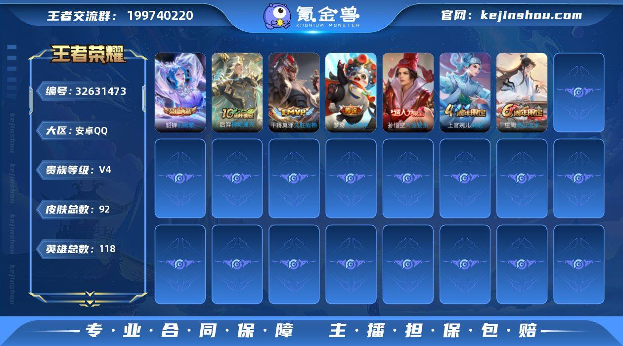 安卓Q 可二次 1典藏3传说 118英雄92皮肤 幻阙歌 神树通天 久胜战神 胖达荣荣 逐霄之志 大圣娶亲 神迹守卫钟馗 狮舞东方 原初追逐者 梁祝 黄忠百相守梦 藏狐褐绒 原初探秘者 水晶猎龙者 暗隐猎兽者 千年之狐 幽灵船长 圣诞狂欢 暗渊魔法 御霄 御旌 御銮 朔风刀 混沌棋 疑决卦 醍醐杖 万华元夜 东方不败 演武夺筹 驱傩正仪 未来纪元赵云 千军破阵 拳王 金庭之子 大漠名商 云中旅人 丁香结 海盐诗旅 擒涛扼浪 魅力维加斯 探海日志 古海寻踪 高山流水 乱世虎臣 鹰眼统帅 王者荣耀账号