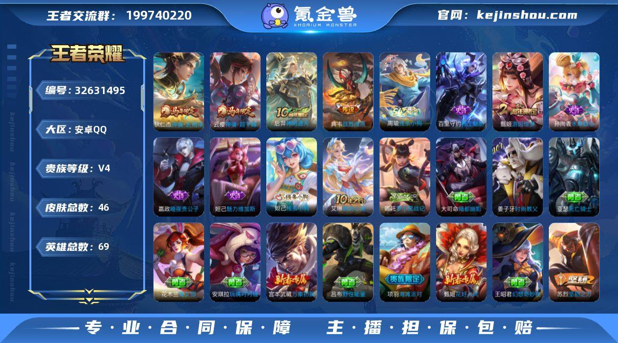 不可二次 安卓Q-V4-荣耀黄金III段位-69英雄-46皮肤-4传说-5史诗 QW2632309 【传说皮肤】:云缨神骥越千峰,狄仁杰神骥赴朔漠,后羿神树通天,典韦战鼓燎原 【限定皮肤】:甄姬游园惊梦,项羽海滩派对 【战令限定】:周瑜线条小狗 【史诗皮肤】:周瑜线条小狗,百里守约特工魅影,甄姬游园惊梦,妲己魅力维加斯,嬴政暗夜贵公子,孙尚香水果甜心 【其他皮肤】:妲己线条小狗,艾琳鹤鸣心笺,哪吒罗小黑战记,大司命暗都幽影,吕布野性能量,苏烈坚韧之力,王昭君幻想奇妙夜,关羽龙腾万里,宫本武藏万象初新,甄姬花好人间,花木兰兔女郎,亚瑟死亡骑士,姜子牙时尚教父,安琪拉玩偶对对碰,项羽海滩派对,暃碧珀绯影,金蝉前尘,云缨赤焰之缨,澜孤猎,镜冰刃幻境,瑶森,李信灼热之刃,伽罗花见巫女,米莱狄精准探案法,明世隐占星师,百里玄策威尼斯狂欢,百里守约绝影神枪,铠龙域领主,大乔伊势巫女,李元芳特种部队,钟馗地府判官,后羿精灵王,孙悟空西部大镖客,狄仁杰锦衣卫,项羽帝国元帅,鲁班七号福禄兄弟 【营地ID】:1545177647