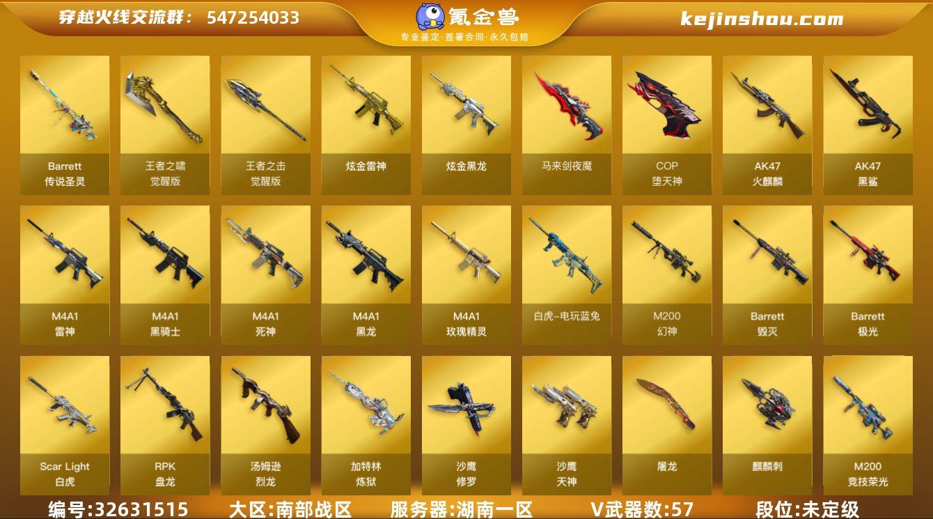 湖南一区-69V-11王者武器数-2炫金武器数 【传说武器】:传说圣灵 【热门武器】:传说圣灵,Scar Light-白虎,M200-幻神,M200-竞技荣光*2,白虎-电玩蓝兔,M4A1-黑骑士,汤姆逊-烈龙*4,RPK-盘龙*6,加特林-炼狱,羊驼玩偶,雷神-小红,裁决-雪莉杨,COP-堕天神,沙鹰-修罗*3,金刚伞 【王者炫金武器】:高爆手雷-雷霆王者*2,炫金黑龙,炫金雷神 【音效卡】:AK47-火麒麟音效卡,M4A1-雷神音效卡*2,M4A1-黑骑士音效卡,Barrett-毁灭音效卡 【皮肤】:幻神-CFS2022,Scar Light-白虎-暗星,雷神-荣耀之魄,雷神-星空,M4A1-战神赵云,雷神-烈虎皮肤,火麒麟-盘古*2,毁灭耀金皮肤,毁灭-CFS2020,毁灭-黑大圣皮肤,黑龙-能量核心,黑骑士-CFS2021,黑骑士-伏羲,AK47-B-常胜将军-曹操*2,AK47-B-常胜将军-刘备*3,AK47-B-常胜将军-孙权,修罗-星空,屠龙-荣耀世冠AG 【角色】:炫,电竞教官-云悠悠,鹰,零·纪元,王者玲珑,王者-魅影,王者玲珑-小乔,初恋灵狐,风暴女,虎妞,麻雀,潘多拉-X,邱刚敖 【人偶武器】:雷神-小红,裁决-雪莉杨,巴雷特-零-水下丽影,COP-旗袍,迷你生化手雷,闪光弹-小乔,闪光弹-貂蝉,高爆手雷-大乔,迷你超能女侍 【挑战大师】:神圣爆裂者...