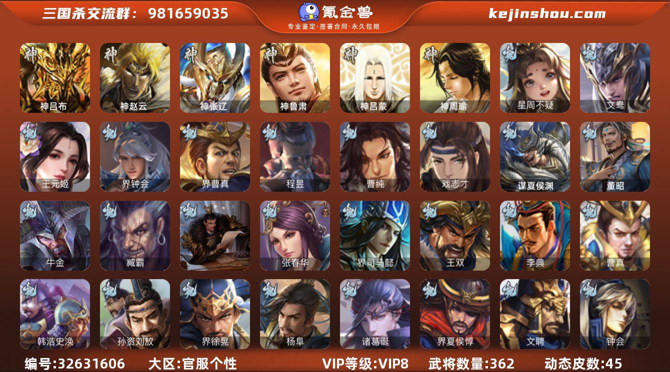 【3830】官阶:大将军;VIP等级:VIP8;史诗武将数量:31;动态皮肤数量:45;武将总数:362;史诗宝珠数量:28;将魂数量:7857;神将:4;魏国史诗武将:29;蜀国史诗武将:10;吴国史诗武将:4;群史诗武将:8