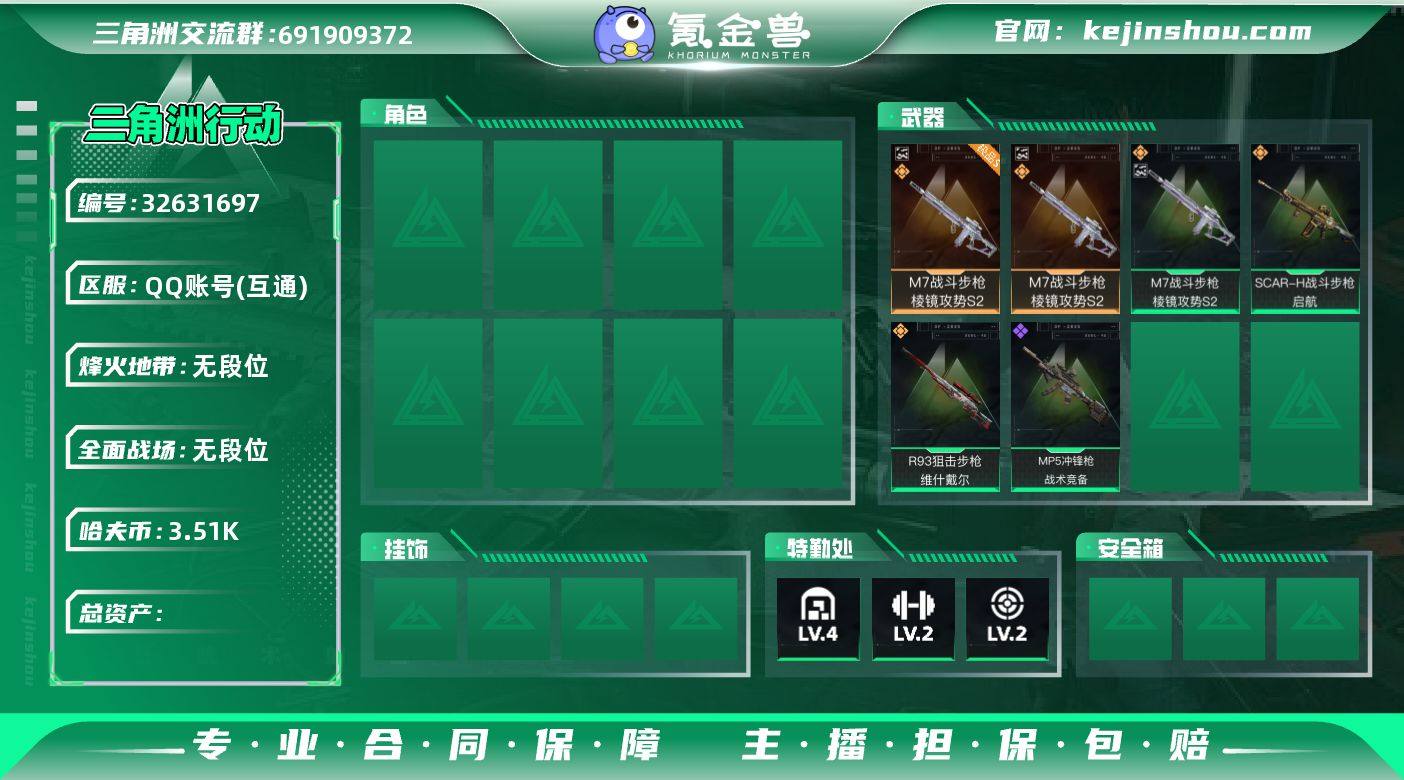 总资产(M):9M/哈夫币(K):3513K/哈夫币(K):3513K/传说枪皮数:6/全面战场等级:1_段位:无段位/烽火地带等级:41_段位:白银/黑鹰/M7战斗步枪-棱镜攻势S2/M7战斗步枪-棱镜攻势S2(优品B)/SCAR-H战斗步枪-启航/M14射手步枪-缄花/SR-25射手步枪-缄花/R93狙击步枪-维什戴尔/.357左轮-缄花/MP5冲锋枪-战术竞备/M7战斗步枪-捣蛋鬼/MP5冲锋枪-哈夫克卫队/P90冲锋枪-捣蛋鬼/SMG-45冲锋枪-行动开启/勇士冲锋枪-旧工业/QBZ95-1突击步枪-三角洲力量/QBZ95-1突击步枪-2026/腾龙突击步枪-三角洲力量/M16A4突击步枪-高雅黑/UZI冲锋枪-海色/野牛冲锋枪-高雅黑/PKM通用机枪-变色龙/M249轻机枪-黄蜂/M250通用机枪-条纹/QJB201轻机枪-三角洲力量/QJB201轻机枪-典雅/SVD狙击步枪-高雅黑/沙漠之鹰-高雅黑/G17-2026/轮式突击炮-荣耀/挂饰-维什戴尔/挂饰-诡影狙击兵/挂饰-诡影喷火兵/挂饰-启程/挂饰-缄花/挂饰-紧急会议