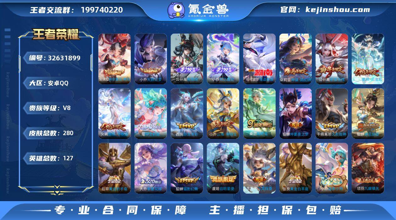 实名: 可修改 性别: 女号 贵族等级: V8 英雄数: 127 皮肤数: 280 荣耀水晶: 天鹅之梦,颠倒童话·魔镜 无双皮: 小乔时之魔女,离恨烟 珍品传说: 怪盗基德 传说皮: 黄金射手座,黄金白羊座,猫影幻舞,久胜战神,仲夏夜之梦,飞鸢探春,游龙清影,遇见胡旋,挚爱花嫁,山海·琳琅生,神骥·鸣幻洲 限定皮: 李小龙,祈雪灵祝,游园惊梦,白鹤梁神女,神威,时之彼端,飞衡,朱雀志,如梦令-嫦娥,高山流水,孙行者,寅虎·心曲,时之祈愿-瑶,时之奇旅-妲己,五谷丰年,山海·碧波行,鸣野蒿,愿照·千秋盛,愿照·众生和 亮点: 【优质装备】:天鹅之梦(小乔典藏),小乔时之魔女(小乔无双),离恨烟(公孙离无双),怪盗基德,黄金射手座,黄金白羊座,猫影幻舞,久胜战神,仲夏夜之梦(大飞蛾),飞鸢探春,游龙清影(小青龙),遇见胡旋,挚爱花嫁,山海·琳琅生(小乔年限),涂山容容,颠倒童话·魔镜