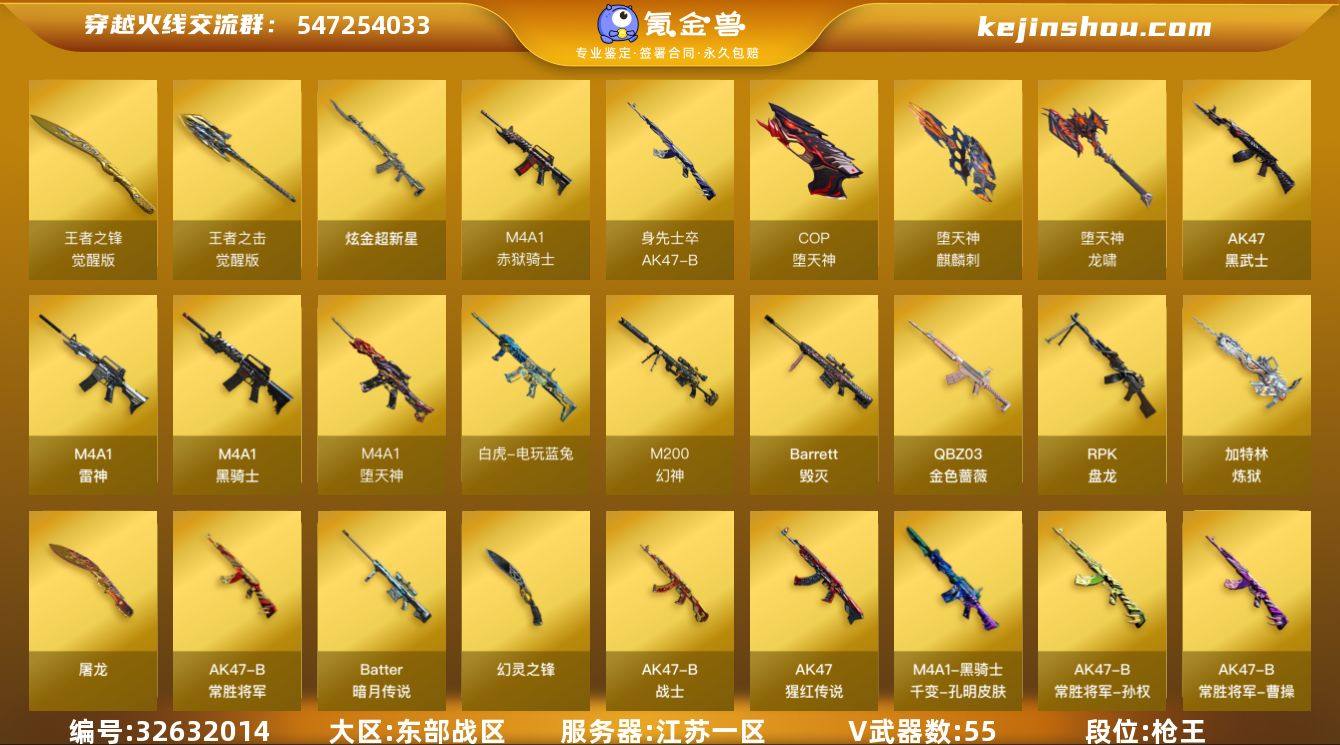 江苏一区-61V-2王者武器数-1炫金武器数 【热门武器】:QBZ03-金色蔷薇,M200-幻神,白虎-电玩蓝兔,M4A1-黑骑士,RPK-盘龙*6,加特林-炼狱,羊驼玩偶,COP-堕天神,金刚伞 【王者炫金武器】:炫金超新星 【音效卡】:M4A1-黑骑士音效卡 【皮肤】:雷神-荣耀之魄,雷神-烈虎皮肤,毁灭-暗月,毁灭-风暴,毁灭-英雄计划 皮肤,M4A1-千变-孔明皮肤,黑武士-典韦皮肤,战神-粉色甜心皮肤,战神-流金岁月皮肤*2,AK47-B-常胜将军-曹操,AK47-B-常胜将军-刘备*2,AK47-B-常胜将军-孙权*3 【角色】:迷迭香,修道士,炽天使,暗夜-X,风暴女*2,虎妞,嘉年华灵狐,灵狐者-X,灵狐者-职业经理,潘多拉-X,潘多拉-甜心教官 【人偶武器】:巴雷特-零-水下丽影,AWM-灵狐-15周年嘉年华,迷你生化手雷*2,闪光弹-貂蝉,高爆手雷-大乔,迷你超能女侍 【挑战大师】:冰龙粉碎者-白马银枪 【英雄级武器】:M4A1-雷神,M4A1-黑骑士,AK47-黑武士,M4A1-堕天神,QBZ03-金色蔷薇,AK-47-猩红传说*2,AK47-B-常胜将军,白虎-电玩蓝兔,AK47-B-身先士卒,AK47-B-战士,Barrett-毁灭,M200-幻神,Barrett-暗月传说*2,RPK-盘龙*6,加特林-炼狱,COP-堕天神,屠龙,麒麟刺-堕天神*3,幻灵之锋,龙啸-...