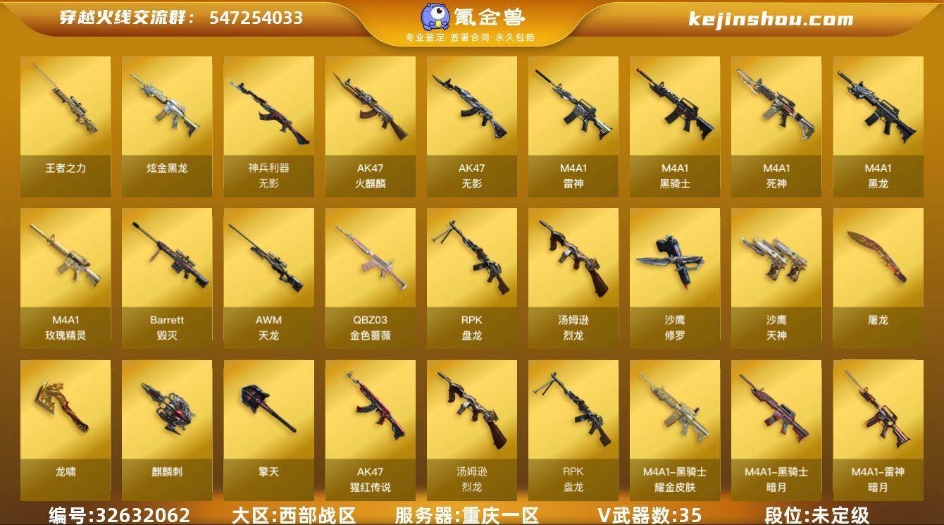 重庆一区-37V-1王者武器数-1炫金武器数 【热门武器】:QBZ03-金色蔷薇,死亡之眼*2,M4A1-黑骑士,汤姆逊-烈龙*6,RPK-盘龙,沙鹰-修罗*5 【王者炫金武器】:王者之力,炫金黑龙 【皮肤】:雷神-暗月,火麒麟-百城,毁灭-暗月,毁灭-黑大圣皮肤,黑龙-能量核心,黑骑士-暗月,黑骑士耀金皮肤,无影-能量核心 【角色】:零,葵,暗夜审判,风暴女,嘉年华灵狐,兰妹妹,灵狐-花神,曼陀罗-X,曼陀罗-礼服,萌儿,铁骑荣耀,雪莉杨-摸金校尉,影武者-X 【人偶武器】:AWM-灵狐-15周年嘉年华,迷你牛魔王 【暴走生化】:死亡之眼*2 【挑战大师】:冰龙粉碎者-白马银枪 【英雄级武器】:AK47-火麒麟,M4A1-黑龙,M4A1-雷神*3,M4A1-黑骑士,AK47-无影,M4A1-死神,无影-神兵利器,M4A1-玫瑰精灵,QBZ03-金色蔷薇,AK-47-猩红传说*2,AWM-天龙,Barrett-毁灭,RPK-盘龙,汤姆逊-烈龙*6,沙鹰-修罗*5,沙鹰-天神*2,屠龙*2,龙啸*2,擎天,麒麟刺 【源级武器】:源·火麒麟,源-黑龙,源·雷神,魂-雷神-萌杀,魂·雷神-15周年嘉年华,御·雷神-葫芦兄弟,源·黑骑士*2,魂·黑骑士-现代金属,魂·黑骑士-幻能朋克,御·黑骑士·哪吒闹海,源·天启*2,源·武圣,源·机械迷城,源-金色蔷薇,源-...