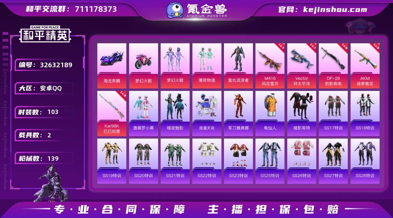 安卓【男神号 粉装-梦幻火箭,套装-浪漫天命,套装-暗影哥特,M416-风花雪月(七级),Vector-环太平洋(七级),海龙奔腾,双人摩托-梦幻火箭】 手Q-3粉装-5特效枪-2载具-1粉色飞行器-43597热力值-10王牌印记-103套装-139枪皮 【热门品类】:粉装-梦幻火箭,套装-浪漫天命,角色-军刀雅典娜,套装-龟仙人,套装-暗影哥特 【粉色套装】:粉装-梦幻火箭,粉装-薄荷物语,角色-复仇流浪者 【粉色枪皮等级】:AKM-绿萝繁花(五级),M416-风花雪月(七级),Vector-环太平洋(七级),Kar98K-巳巳如意(五级),DP-28-豹影疾电(五级) 【粉色载具】:海龙奔腾,双人摩托-梦幻火箭 【粉色枪皮】:AKM-绿萝繁花,M416-风花雪月,Vector-环太平洋,Kar98K-巳巳如意,DP-28-豹影疾电 【粉色飞行器】:梦幻火箭飞行器 【粉色降落伞】:梦幻火箭降落伞,蓝莓炮弹降落伞,环太平洋降落伞,江南烟雨降落伞,金丰海韵降落伞,炫彩糖果降落伞 【稀有套装】:套装-龟仙人 【稀有枪皮】:AKM-彩虹符号,AKM-海渊国主,AKM-环太平洋,AKM-虎虎生威,M16A4-凝视深渊,M16A4-幻世战舞者,M16A4-甜心亚梦,SCAR-L-炫彩节奏,SCAR-L-玉兔迎春,SCAR-L-红色方程式,SCAR-L-黄金龙骨,M416-糯团青竹,M416-蓝色火...