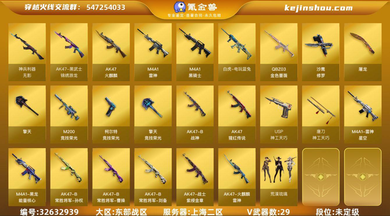 上海二区-31V-0王者-0炫金 【热门武器】:QBZ03-金色蔷薇,M200-竞技荣光,白虎-电玩蓝兔,M4A1-黑骑士,裁决-雪莉杨,沙鹰-修罗 【音效卡】:M4A1-黑骑士音效卡 【皮肤】:金色蔷薇-电竞之星 皮肤,雷神-星空,雷神-神秘按键 皮肤,火麒麟-雷神,火麒麟-心动糖果,黑龙-能量核心,战神-紫绶金章皮肤,AK47-B-常胜将军-曹操,AK47-B-常胜将军-刘备,AK47-B-常胜将军-孙权 【角色】:荒漠琉璃,乔伊教练,初恋灵狐,芳心审判者,嘉年华灵狐,麻雀,潘多拉-X,潘多拉-甜心教官,斯沃特-X,兔囡囡,樱-战斗天使 【人偶武器】:裁决-雪莉杨,M4A1-雷神-精英刀锋,AWM-灵狐-15周年嘉年华,黄金迷你深渊冰龙,迷你裂空之翼,迷你波特博士*2,夺魂,迷你火种,迷你超能女侍,灵狐娃娃手雷 【暴走生化】:超级对讲机 【挑战大师】:冰龙粉碎者-白马银枪,激光毁灭者III,机甲撕裂者III,试炼破坏者III 【英雄级武器】:AK47-火麒麟,M4A1-雷神,M4A1-黑骑士,无影-神兵利器,黑武士-锦绣游龙,QBZ03-金色蔷薇,AK-47-猩红传说*2,AK47-B-战神,白虎-电玩蓝兔,M200-竞技荣光,沙鹰-修罗,柯尔特-竞技荣光,USP-神工天巧,屠龙,擎天,擎天-竞技荣光,唐刀-神工天巧,高爆手雷-竞技荣光...