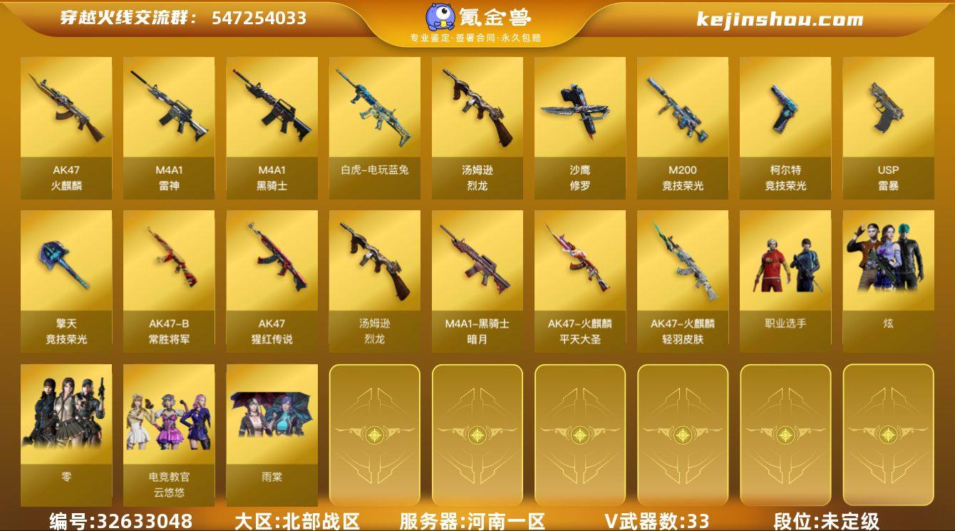 河南一区-35V-1王者-0炫金 【热门武器】:M200-竞技荣光,白虎-电玩蓝兔,Kar98K-星神,M4A1-黑骑士,汤姆逊-烈龙*2,USP-雷暴,沙鹰-修罗*4 【音效卡】:M4A1-黑骑士音效卡,Kar98K-星神音效卡 【皮肤】:雷神-荣耀之魄,雷神-宇航兔皮肤,火麒麟-轻羽皮肤,火麒麟-平天大圣,黑骑士-暗月,炼狱-星空 【角色】:雨棠,电竞教官-云悠悠,蛇隐宗,北极狐-X,初恋灵狐,芳心审判者,虎妞,零-水下丽影,麻雀,曼陀罗-X,潘多拉-X,蛇姬,蜀雪,铁骑荣耀,兔囡囡,职业选手 【人偶武器】:天龙-曼陀罗,火麒麟-灵狐,Scar Light-马枪,迷你超能女侍 【暴走生化】:超级对讲机 【挑战大师】:激光毁灭者III 【英雄级武器】:AK47-火麒麟*3,M4A1-雷神*2,M4A1-黑骑士,AK-47-猩红传说*2,AK47-B-常胜将军,王者白虎-觉醒版,白虎-电玩蓝兔,Kar98K-星神,M200-竞技荣光,汤姆逊-烈龙*2,沙鹰-修罗*4,USP-雷暴,柯尔特-竞技荣光*2,擎天-竞技荣光,高爆手雷-竞技荣光*3,高爆手雷-古蛇迷踪,闪光弹-竞技荣光*3,烟雾弹-竞技荣光*3,烟雾弹-古蛇迷踪 【道具】:云山科技背包,炫彩背包,虎牙炫彩背包,绿色巨人,灵魂忍者,迷雾幽灵,夺命之镰,防化服*3,枪王排位29赛季金色流光,...