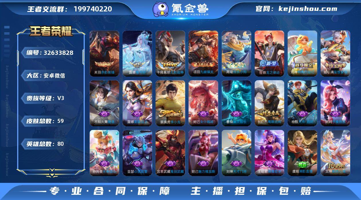 【mwz299】安卓WX-V3-最强王者段位-80英雄-59皮肤-1典藏皮肤-2传说-18史诗 【荣耀典藏】:关羽赤影疾锋 【传说皮肤】:露娜霜月吟,干将莫邪久胜战神 【限定皮肤】:狄仁杰阴阳师,项羽海滩派对,裴擒虎李小龙,姬小满妄想食味 【赛季限定】:太乙真人谧流熔炉,钟馗虚灵犬护,甄姬逆浪荇歌,亚瑟荣光之誓,项羽九幽镇关 【战令限定】:刘禅鸭鸭历险记,沈梦溪鸭鸭历险记,周瑜线条小狗 【史诗皮肤】:周瑜线条小狗,项羽九幽镇关,狂铁龙之律动,刘禅鸭鸭历险记,姬小满妄想食味,杨戬天秀启明,裴擒虎李小龙,不知火舞魅语,狄仁杰鹰眼统帅,阿轲节奏热浪,刘禅天才门将,亚瑟心灵战警,曹操幽灵船长,妲己女仆咖啡,妲己魅力维加斯,孙尚香水果甜心,宫本武藏鬼剑武藏,王昭君偶像歌手,露娜紫霞仙子 【其他皮肤】:虞姬溯影追猎,艾琳鹤鸣心笺,亚瑟荣光之誓,莱西奥踏浪烽翎,庄周锦麟游梦,甄姬逆浪荇歌,白起死霸装,阿古朵布丁狗之约,张良灵野札记,沈梦溪鸭鸭历险记,钟馗虚灵犬护,刘备浪漫序章,戈娅玫蓝誓约,太乙真人谧流熔炉,大司命暗都幽影,莱西奥西部游侠,牛魔牛运亨通,吕布野性能量,钟无艳海滩丽影,狄仁杰阴阳师,宫本武藏万象初新,甄姬花好人间,达...