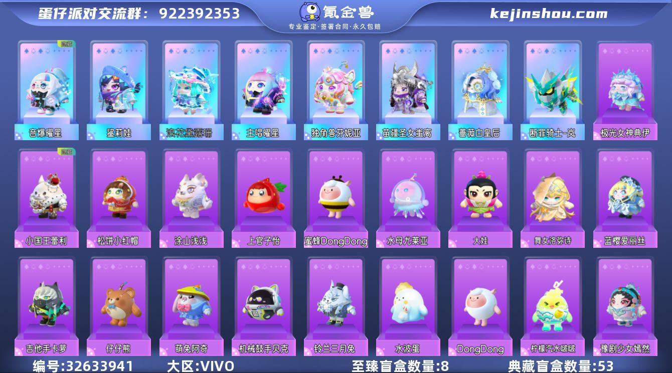 【3载具8至臻53典藏35至臻配饰音爆曜星主唱曜星2只羊dongdong蜜蜂dongdong绝版云梦兜兜龙月影摇摇兔星河弹弹车鲨莉娃蔷薇白皇后苗疆圣女蚩离独角兽芬妮亚浪花黛露珊断罪骑士岚大翅膀月白之隐垂耳兔背包电极蝴蝶结众星孤月浅海蓝灵热门紫皮小猪妖水波蛋联动皮梨花诗美羊羊小灰灰雪王上官子怡】账号类型: 手机账号 段位: 三阶鸡蛋 热门装扮: DongDong,水波蛋,机械鼓手贝克,吉他手卡萝,仔仔熊,萌兔阿奇,淘气丸子,断罪骑士-岚,铃兰三月兔,蓝樱爱丽丝,蔷薇白皇后,涂山浅浅,松饼小红帽,上官子怡,蜜蜂DongDong,水母尤莱亚,圆圆子,饶舌诗人,仓鼠米仔,机械师维迪,刺猬绷绷,小太阳葵葵,苗疆圣女蚩离,神月将军夜魄,天狗刑云,梨花诗,元气丸子,独角兽芬妮亚,飞天小猪班尼,小国王蕾利,极光女神典伊,小灰灰,美羊羊,御狸奴,神兽嘲风,京剧少年封闲,豫剧少女嫣然,音爆曜星,主唱曜星,雪怪瓦图鲁,仙人掌丘丘,狸猫大力,企鹅心心,小猪妖,雪王,音乐家蕾利,鲨莉娃,猴吼吼,发美美,石心船长苏勒,幽猎塞莉诺,大亨波利,浪花黛露珊,沉眠的螺壶,狼执事柯尔特,破誓骑士凯恩,小福袋添运,暹罗猫,大娃,舞女洛弥诗,柠檬汽水啵啵载具-月影摇摇兔,星河弹弹车,云梦兜兜龙月白之隐,众星孤月,浅海蓝灵,音浪星梦,天使·微...
