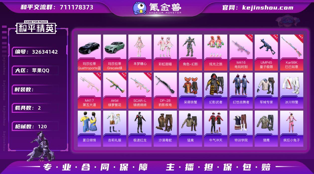 237-【无二次协助处理】【因赛季更新游戏段付以上号为准!】 苹果Q-2载具4粉装8特效枪5热门97套装120枪皮 4印记 历史卓越王牌10星 【2载具】 玛莎拉蒂G绿色 玛莎拉蒂Q蓝色 【4粉装】 虹云熊熊 炫光之旅 羊梦糖心 彩虹甜喵 【8特效枪】 SCAR-L-锦绣绵绵 (5级) M416-电玩时刻 (5级) AKM-绿萝繁花 (5级) Kar98K-巳巳如意 (5级) DP-28-豹影疾电 (5级) UMP45-量子极限 (5级) M417-第五大道 (5级) Mk14-福马献瑞 (5级) 【5热门】 呆萌铁蟹 纯白誓言 破蛋小黄鸡 极速红龙 英勇保护者