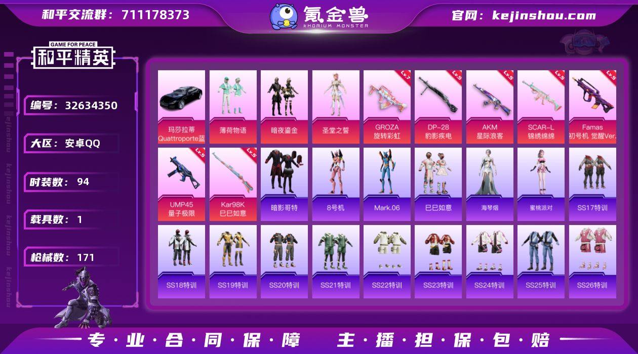安卓 手Q-3粉装-7特效枪-1载具-2粉色飞行器-49724热力值-8王牌印记-94套装-171枪皮 【热门品类】:套装-暗影哥特,角色-8号机,角色-Mark.06 【粉色套装】:粉装-薄荷物语,粉装-暗夜鎏金,角色-圣堂之誓 【粉色枪皮等级】:AKM-星际浪客(五级),SCAR-L-锦绣绵绵(五级),GROZA-旋转彩虹(七级),Famas-初号机 觉醒Ver.(五级),UMP45-量子极限(五级),Kar98K-巳巳如意(五级),DP-28-豹影疾电(五级) 【粉色载具】:玛莎拉蒂Quattroporte(夜幕蓝) 【粉色枪皮】:AKM-星际浪客,SCAR-L-锦绣绵绵,GROZA-旋转彩虹,Famas-初号机 觉醒Ver.,UMP45-量子极限,Kar98K-巳巳如意,DP-28-豹影疾电 【粉色飞行器】:炫彩糖果飞行器,纯梦嫁纱飞行翼 【粉色降落伞】:洛神天依降落伞,旋转彩虹降落伞,青空秋雨降落伞,暗夜鎏金降落伞,沙丘之主降落伞,创世·救赎降落伞,初号机 觉醒Ver.降落伞,忍者神龟降落伞,异瞳寒姬降落伞,炫彩糖果降落伞 【稀有套装】:套装-巳巳如意,套装-炫彩糖果,角色-海琴烟,角色-蜜桃派对 【稀有枪皮】:AKM-彩虹符号,AKM-影袭,AKM-灼热熔岩,AKM-生命誓言,AKM-破晓战魂,AKM-虎虎生威,AKM-霓虹街区,AKM-龙的传人,M16A4-幻世战舞者,M16A4-甜心亚梦...