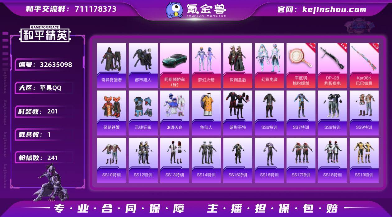 【937177】苹果【小号 梦幻火箭/都市猎人/暗影哥特/UMP45-萌骑冒险(三级)/阿斯顿马丁DBS(绿)/百万伏特背包(1级)】 手Q-3粉装-5特效枪-1载具-2粉色飞行器-76198热力值-9王牌印记-201套装-241枪皮 【热门品类】:粉装-梦幻火箭,套装-浪漫天命,套装-都市猎人,套装-奇异狩猎者,套装-龟仙人,套装-暗影哥特 【粉色套装】:粉装-深渊皇后,粉装-梦幻火箭,粉装-幻彩电音 【粉色枪皮等级】:UMP45-萌骑冒险(三级),Kar98K-巳巳如意(五级),Mk14-福马献瑞(五级),DP-28-豹影疾电(五级),平底锅-桃粉嫣然(七级) 【粉色载具】:阿斯顿马丁DBS(绿) 【粉色枪皮】:UMP45-萌骑冒险,Kar98K-巳巳如意,Mk14-福马献瑞,DP-28-豹影疾电,平底锅-桃粉嫣然 【粉色飞行器】:梦幻火箭飞行器,青春物语飞行器 【粉色降落伞】:神秘黑猫降落伞,古堡领主降落伞,银刃赛罗降落伞,王牌四分卫降落伞,星之彼岸降落伞,筑梦精灵降落伞,萌物绒绒降落伞,蜜语绒猫降落伞,千金淑猫降落伞,星穹咏叹调降落伞,炫彩糖果降落伞 【稀有套装】:套装-龟仙人,套装-马上有钱,套装-雨过天青,套装-红釉青花 【稀有枪皮】:AKM-夜灯,AKM-奇异狩猎者,AKM-彩虹符号,AKM-星之彼岸,AKM-灼热熔岩,AKM-...