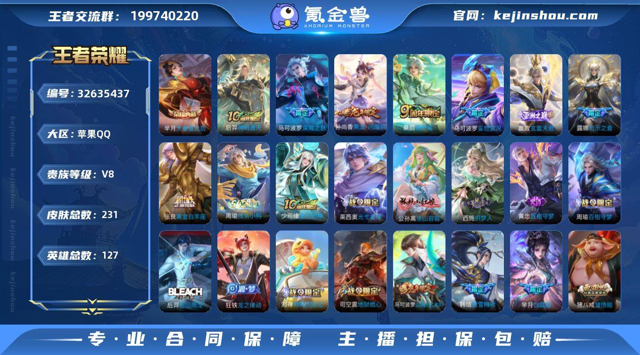 实名: 可修改 性别: 男号 贵族等级: V8 英雄数: 127 皮肤数: 231 荣耀水晶: 大秦宣太后 传说皮: 黄金白羊座,妄想实况,乘龙·问璇玑,玄雷天君,神树通天 限定皮: 李小龙,龙胆,白晶晶,天狼溯光者,逐梦之星,寅虎·御盾,霸王别姬-虞姬,高山流水,猪悟能,傲雪梅枪,启示之音,深海之息,五谷丰年,山海·玄木吟,鸣野蒿 亮点: 【优质装备】:大秦宣太后,黄金白羊座,妄想实况,玄雷天君,涂山容容