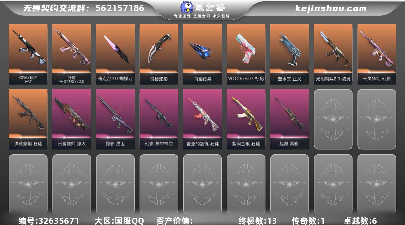 【931561】黑波 天御 鬼丸 qyz9433 【近战武器】:近战武器-碎心裂刃,近战武器-奇点//2.0 蝴蝶刀,近战武器-黑波之刃,近战武器-鬼丸国纲,近战武器-天御刀,近战武器-诡秘蛇影 军刀,近战武器-日耀风暴 遗器 【狂徒】:狂徒-洪荒怒焰,狂徒-ORA x 颗秒,狂徒-千灵华绽//2.0,狂徒-盖亚的复仇,狂徒-紫阙金琅,狂徒-诡秘蛇影 【幻影】:幻影-千灵华绽,幻影-神中神罚,幻影-末日之翼 【戍卫】:戍卫-掠影,戍卫-折光棱晶 【獠犬】:獠犬-日冕雄师 【冥驹】:冥驹-起源 【飞将】:飞将-末日之翼 【莽侠】:莽侠-诡秘蛇影 【奥丁】:奥丁-末日之翼 【判官】:判官-诡秘蛇影 【骇灵】:骇灵-光明哨兵//2.0 【蜂刺】:蜂刺-折光棱晶 【标配】:标配-折光棱晶 【VCT手枪】:标配-VCT25 x BLG 【正义】:正义-塑水宗 【鬼魅】:鬼魅-诡秘蛇影,鬼魅-扑棱扑棱 【短炮】:短炮-末日之翼 【卡面】:激斗汉堡 卡面,无畏契约:暮蝶 卡面,归乡 // 蝰蛇 卡面,Clutch 卡面,梦幻奶茶 卡面,无畏契约GO!第一卷:芮娜 卡面,无畏契约GO!第一卷:零 卡面,《双城之战》金克丝 卡面,同步耍酷 卡面,钢锁vs盖可 卡面,代号红色 卡面,新兵报到 卡面,V契约 卡面,无畏契约 卡面 【喷漆】:...