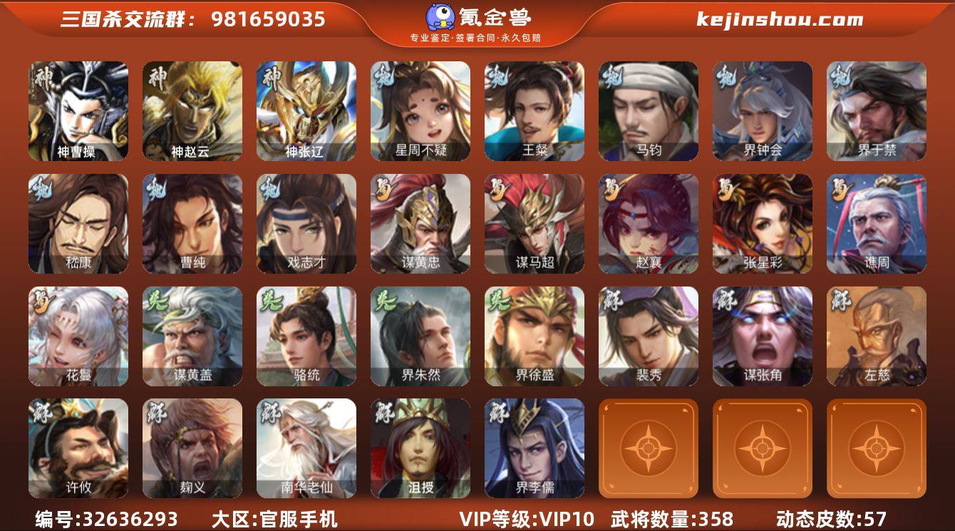 【12】官阶:大将军;VIP等级:VIP10;史诗武将数量:33;动态皮肤数量:57;武将总数:358;史诗宝珠数量:0;将魂数量:0;神将:5;魏国史诗武将:31;蜀国史诗武将:91;吴国史诗武将:81;群史诗武将:88 神曹操,神赵云,神张辽,神吕蒙,神周瑜,星周不疑,王粲,马钧,界钟会,界于禁,嵇康,程昱,曹纯,戏志才,牛金,臧霸,张春华,界司马懿,王双,于禁,李典,界夏侯渊,曹真,韩浩史涣,孙资刘放,徐晃,界徐晃,杨阜,诸葛诞,界夏侯惇,曹彰,文聘,钟会,界张辽,界曹操,司马朗,曹植,郭皇后,郭淮,辛宪英,乐进,李通,袁涣,界典韦,界邓艾,陈群,界郭淮,界许褚,界王异,吕虔,辛毗,界甄姬,朱灵,界荀彧,界曹丕,崔琰,界郭嘉,杜畿,阮慧,钟繇,王基,满宠,曹休,界满宠,鲁芝,张恭,曹叡,曹冲,曹昂,卞夫人,SP姜维,SP关羽,SP蔡文姬,邓艾,夏侯渊,典韦,甄姬,司马懿,张郃,谋徐晃,许褚,谋于禁,夏侯惇,界曹彰,荀彧,郭嘉,荀攸,界曹植,王异,曹仁,曹丕,曹洪,曹操,SP庞德,SP贾诩,张辽,甘夫人,谋黄忠,谋马超,赵襄,张星彩,谯周,花鬘,关索,蜀-孟达,刘谌,蒋琬费祎,傅彤,马良,李严,夏侯霸,界马超,吴苋,秦宓,关兴张苞,廖化,谋张飞,诸葛果,界庞统,关平,界马岱,赵统赵广,界简雍,法正,界卧龙诸葛,界张飞,界关兴张苞,简雍,周仓,SP徐庶,SP孙尚香,...