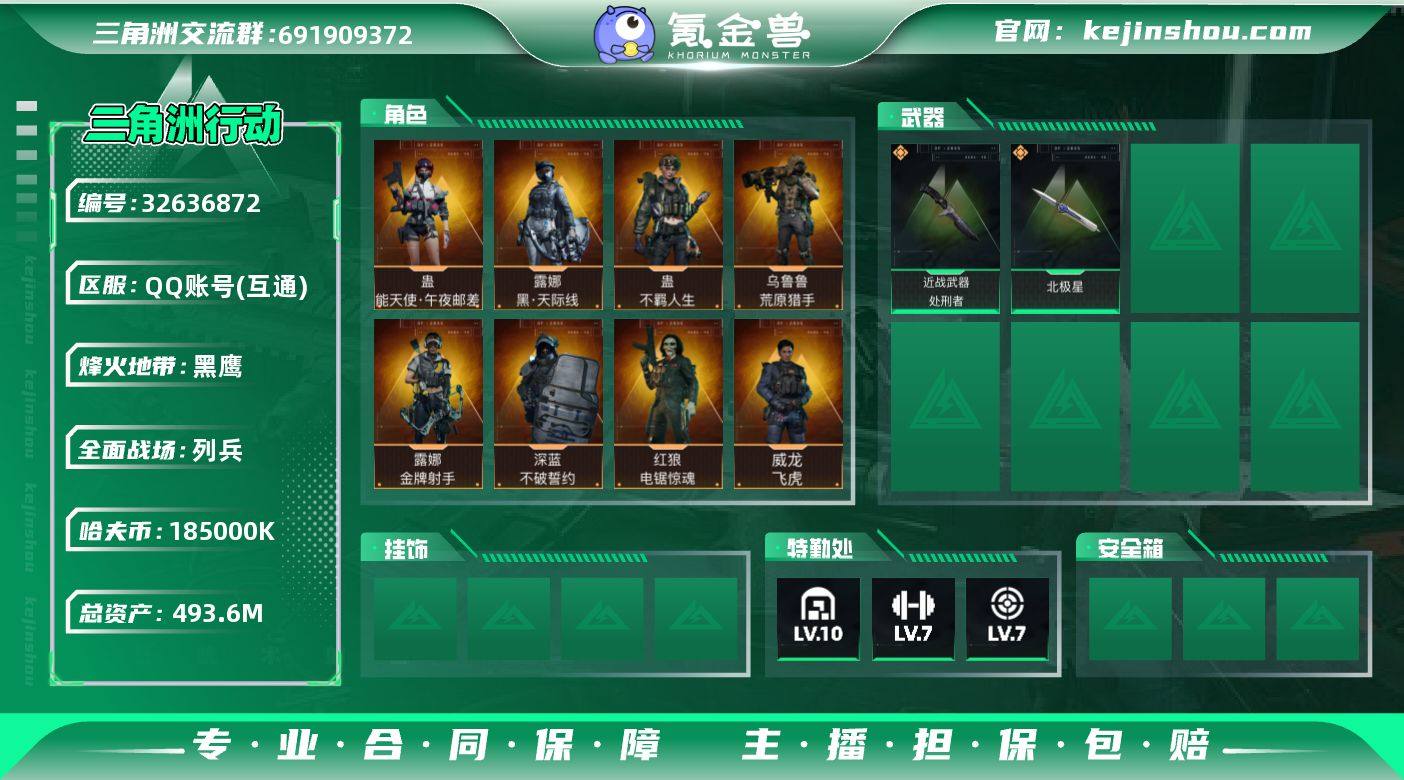 SZ6472/【个人信息】战场等级35列兵,/行动等级60黑鹰/【哈夫币】18500w/【总资产】493.6M/【货币】62三角券/15三角币/【安全箱】S8进阶安全箱4(2x2)/S8高级安全箱6(2x3)/S8顶级安全箱9(3x3)/【安全箱皮肤】零号玩家/【特勤处】技术中心Lv.3/工作台Lv.3/制药台Lv.3/防具台Lv.3/仓库Lv.10/指挥中心Lv.6/训练中心Lv.7/靶场Lv.7/潜水中心Lv.2/收藏室Lv.2/【仓库】338AP/【通行证】烽火地带限定版/【角色皮肤】露娜-黑天际线/蛊-能天使午夜邮差/蛊-不羁人生/乌鲁鲁-荒原猎手/露娜-金牌射手/红狼-电锯惊魂/深蓝-不破誓约/威龙-飞虎/蜂医-送葬人无题密令/【已有捆绑包】荼蘼捆绑包/悠然茶歇捆绑包/特斯拉线圈捆绑包/尖峰行动捆绑包/北极星捆绑包/飞虎捆绑包/捞点薯条捆绑包/【近战皮肤】近战-北极星/近战-处刑者/近战-黑鹰/【挂饰】挂饰-阿米娅/黄金视野/挂饰-彩蛋/挂饰-北极星/挂饰-能天使/赤霄游龙/挂饰-维什戴尔/挂饰-卡皮巴拉/挂饰-雪松/挂饰-三联装手炮/挂饰-大白鹅/挂饰-蚀金玫瑰/挂饰-集群装置/牛角威龙/挂饰-骑士之心/挂饰-黑/福禄/挂饰-雪人/挂饰-启程/祥龙/窃风密探/挂饰-坦克/【步枪皮肤】腾龙突击步枪-猎鳄行动/AUG突击步枪-紧急戒备/K437突击步枪-守护者/ASh-12战斗步枪...