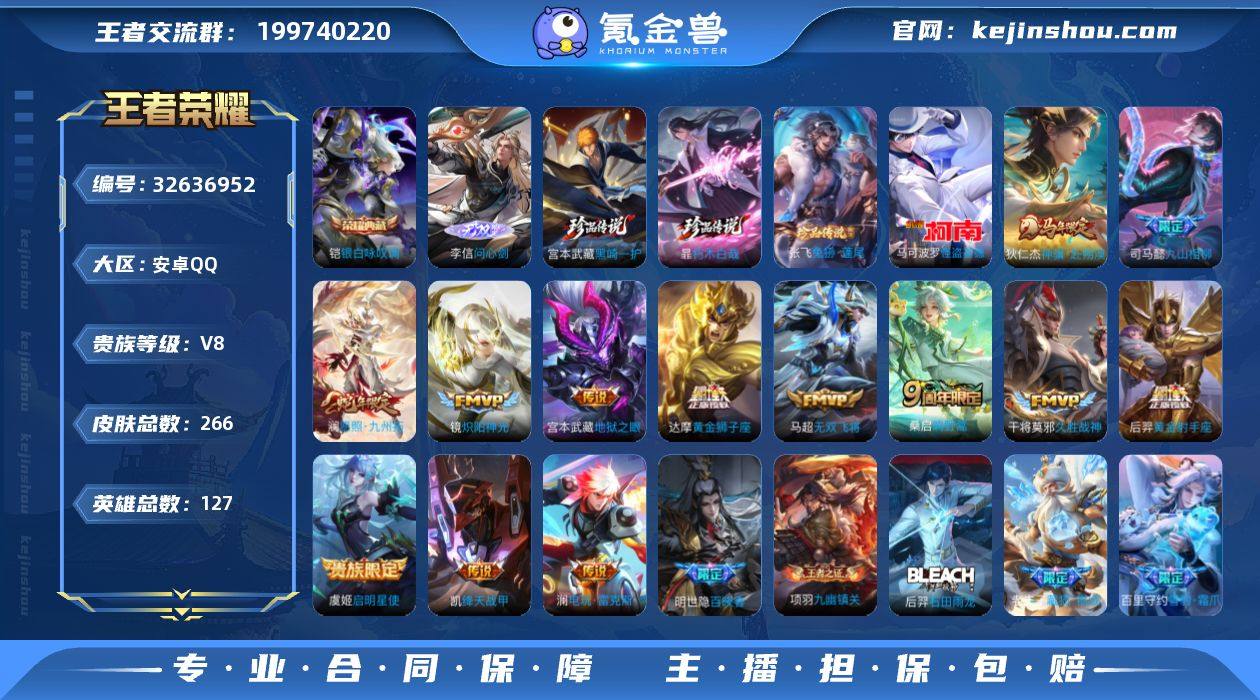 【王者荣耀】珍品无双0 典藏1 无双1 珍品传说4 传说14 史诗71 英雄127 皮肤266 贵族8级 荣耀典藏:银白咏叹调__无双皮肤:问心剑__珍品传说:怪盗基德|兔狲·蓬尾|朽木白哉|黑崎一护__传说皮肤:鸣野蒿|无双飞将|绛天战甲|炽阳神光|启明星使|地狱之眼|久胜战神|黄金狮子座|黄金射手座|电玩·雷克斯|逐花归海|愿照·九州拓|九山相柳|神骥·赴朔漠__稀有限定:蔷薇恋人|神威|李小龙|梁祝|山海·玄木吟|拒霜思|暗影游猎|冰锋战神|大漠名商|地狱燃心|高山流水|古海寻踪|海滩派对|海盐诗旅|胡桃夹子|华丽摇滚|皇家上将|混沌棋|剑破天穹|江河有灵|金庭之子|狂想玩偶喵|魔术师|千军破阵|擒涛扼浪|驱傩正仪|燃音魔法|荣光圣徽|沙漠行僧|死亡摇滚|探海日志|醍醐杖|天穹祈灯|万华元夜|无心|五谷丰年|纤云弄巧|星界游侠|演武夺筹|疑决卦|阴阳师|游园惊梦|驭风魔法|原初追逐者|暗夜贵公子|暗隐猎兽者|暗渊魔法|冰雪圆舞曲|乘风破浪|德古拉伯爵|电玩小子|功夫厨神|鬼剑武藏|金属风暴|龙骑士|魅力维加斯|魅语|梦奇-顽趣|女仆咖啡|偶像歌手|赏金猎手|圣诞狂欢|圣诞恋歌|水果甜心|水晶猎龙者|天秀·启明|赵云-未来纪元|星夜王子|摇滚巨星|鹰眼统帅|幽灵船长|逐浪之夏|紫霞仙子|谪仙醉月|噬灭天穹|敬我三分...