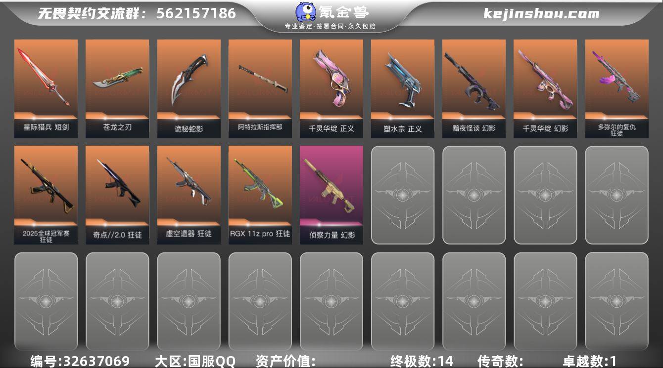 【937046】可二次 玩够能回血 显卡25狂徒 掠夺爪 qyz9601 【近战武器】:近战武器-影钩,近战武器-5周年//公测重制版 苍龙之刃,近战武器-诡秘蛇影 军刀,近战武器-阿特拉斯指挥部 甩棍,近战武器-星际猎兵 短剑 【狂徒】:狂徒-2025全球冠军赛,狂徒-奇点//2.0,狂徒-虚空遗器,狂徒-RGX 11z Pro,狂徒-多弥尔的复仇,狂徒-诡秘蛇影 【幻影】:幻影-黯夜怪谈,幻影-千灵华绽,幻影-侦察力量,幻影-末日之翼 【戍卫】:戍卫-折光棱晶 【飞将】:飞将-末日之翼 【莽侠】:莽侠-诡秘蛇影 【奥丁】:奥丁-末日之翼 【判官】:判官-诡秘蛇影 【蜂刺】:蜂刺-折光棱晶 【标配】:标配-折光棱晶 【正义】:正义-千灵华绽,正义-塑水宗 【鬼魅】:鬼魅-诡秘蛇影,鬼魅-扑棱扑棱 【短炮】:短炮-末日之翼 【卡面】:无畏契约:暮蝶 卡面,热舞环节 卡面,树懒大作战 卡面,红鳞松叶 卡面,无畏契约GO!第一卷:芮娜 卡面,无畏契约GO!第一卷:零 卡面,无垠星环 卡面,《双城之战》金克丝 卡面,代号红色 卡面,新兵报到 卡面,V契约 卡面,无畏契约 卡面 【喷漆】:伤心心 喷漆,审判之爪 喷漆,买装还是存钱 喷漆,酷熊冲浪 喷漆,红鳞 喷漆,无畏契约GO!第一卷:零 喷漆,松...