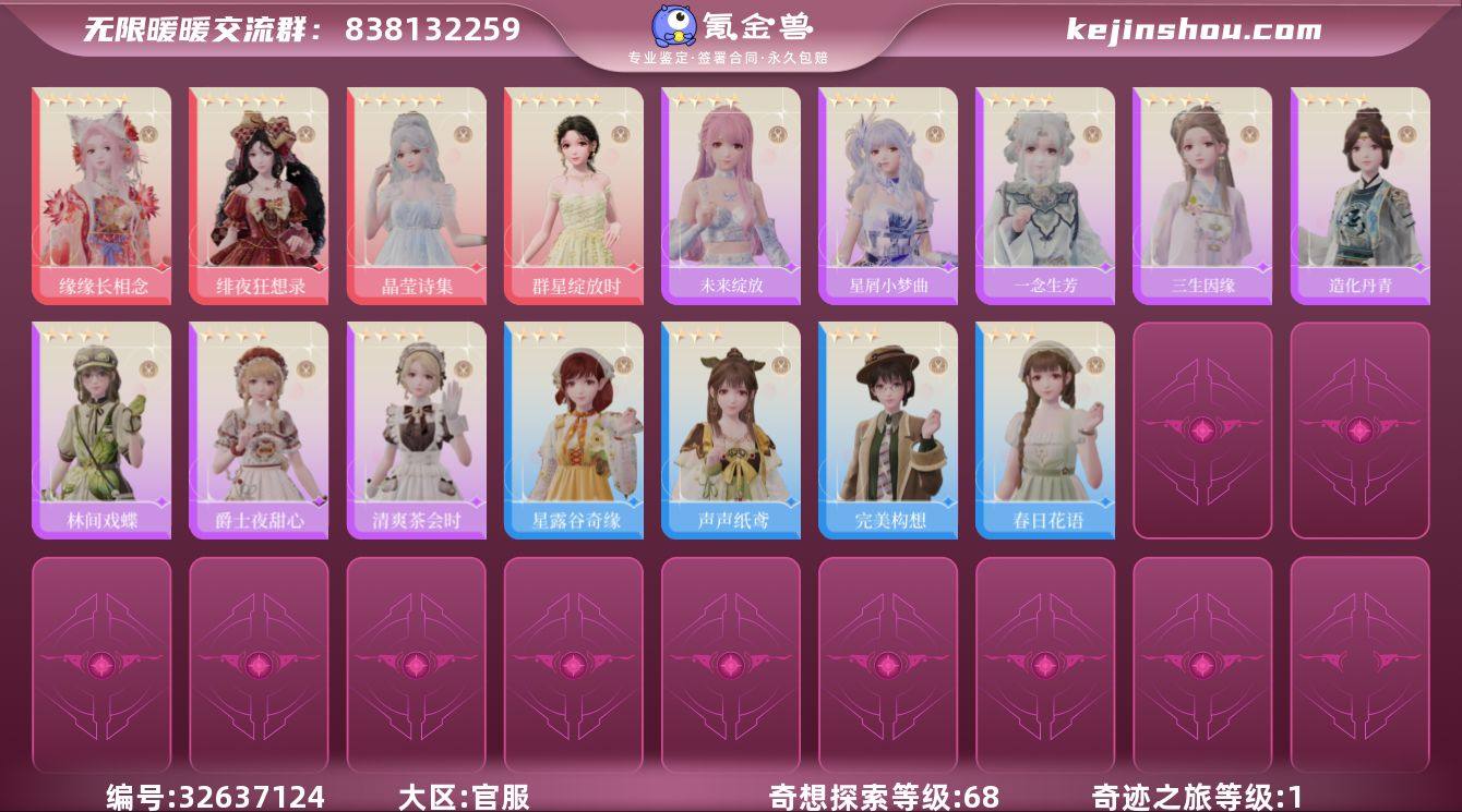 奇迹之旅等级:28 奇想探索等级:91 生于无瑕,缘缘长相念,雪境长歌,绽响黎明前,晶莹诗集,谕浪希声,天鹅童话,群星绽放时,蝶屿风袭,心愿金蔷薇 揽星入梦,穗风过昨日,未来绽放,星屑小梦曲,三生因缘,一念生芳,造化丹青,林中雾语,鎏金旧事,云朵白日梦,气球漫游记,林间寻蜜,迷花燃梦,花舞绵绵,雾影飘灵,只影片梦,心享芳语,焰光灼灼,长相思,璨耀夜庭,恒久羁绊,湖的女儿,粉缎带圆舞曲,林间戏蝶,爵士夜甜心,潮汐鲨影,清爽茶会时,笔尖漾奇彩 卖家说:91级开服账号,鱼套,气球套,蝴蝶套,猫套,神女套,女巫套,萤火虫套