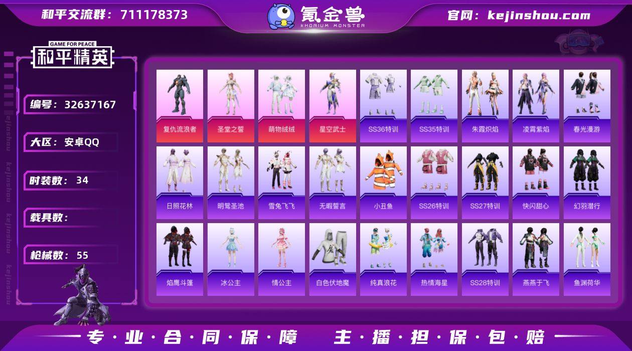 【和平精英】4粉装,4特效枪,0载具,历史最高段位:超级王牌6星 王牌印记2次 热力值:30841,65套装,115枪械,130装备,62战备;套装:角色-复仇流浪者,套装-萌物绒绒,角色-圣堂之誓,角色-星空武士,套装-猎鹰,套装-白色伏地魔,套装-深蓝色名流,套装-酒红色名流,套装-湖蓝色名流,套装-黄色名流,套装-雨林探路者,套装-浪漫假日,套装-特殊使命,套装-魅力单车,套装-幻世战舞者,套装-小丑鱼,套装-破蛋小黄鸡,套装-霓虹街区,套装-白糯汤圆,套装-战术大师,套装-狙击之神,套装-热情海星,套装-纯真浪花,套装-雪兔飞飞,套装-柠萌假日,套装-日照花林,套装-龟仙人,套装-SS25特训,套装-惊鸿侠骨,套装-锦衣飞扬,套装-SS26特训,套装-快闪甜心,套装-春光漫游,套装-空岛之星,套装-无暇誓言,套装-明鸳圣池,套装-云魄琉璃,套装-焰鹰斗篷,套装-幻羽潜行,套装-SS27特训,套装-老实芭蕉,套装-SS28特训,角色-情公主,角色-冰公主,套装-海盐绵绵冰,套装-异域银装,角色-许七安,角色-怀庆长公主,套装-SS31特训,套装-鱼渊荷华,套装-燕燕于飞,套装-SS33特训,套装-巳巳如意,套装-SS32特训,套装-顶瓜瓜,角色-灵公主,套装-霓虹热舞,玩偶服-喜羊羊,套...
