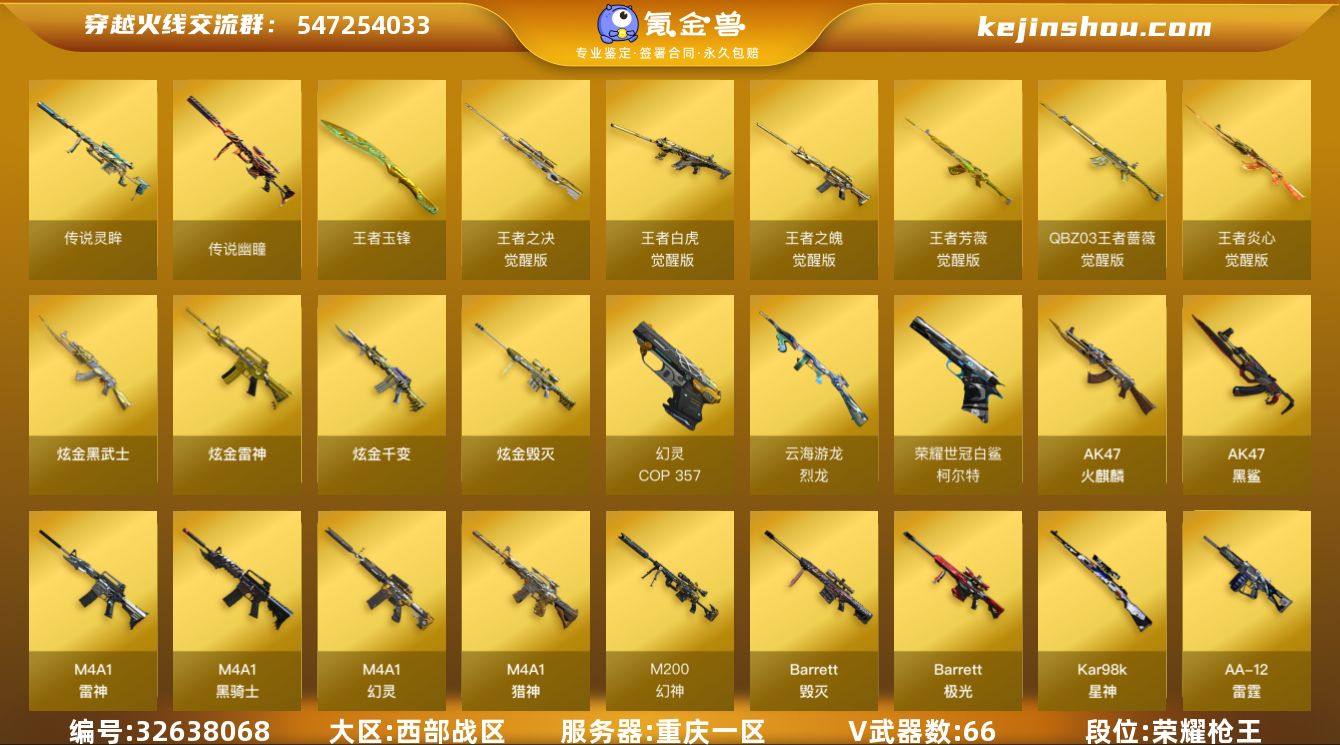 重庆一区-78V-10王者武器数-4炫金武器数 【传说武器】:传说灵眸,传说幽瞳 【热门武器】:传说幽瞳,传说灵眸,G36C-幻影,HK417-朱雀,M4A1-青龙,M200-幻神,柯尔特-荣耀世冠白鲨2023,Kar98K-星神,Cat-刀锋,牛牛-AK47,M4A1-黑骑士*3,雷神-小红,裁决-雪莉杨,COP-白鲨,COP 357-幻灵,沙鹰-修罗*3 【王者炫金武器】:王者玉锋,炫金千变,炫金雷神,炫金武士,炫金毁灭 【音效卡】:修罗-云海游龙音效卡,M4A1-黑骑士音效卡,Barrett-极光音效卡,HK417-朱雀音效卡 【皮肤】:幻神-荣耀世冠白鲨2023 皮肤,星神-璀璨皮肤,雷神-星空,雷神-R.LGD-CFPLS18冠军,雷神-15周年嘉年华 皮肤,火麒麟-百城,火麒麟-大唐荣光,毁灭-冠军之怒,毁灭-战神张飞,毁灭-英雄计划 皮肤,AWM-天龙-传奇白鲨,修罗-能量核心,修罗-冠军之魂,修罗-15周年嘉年华 皮肤 【角色】:影豹,鹰,隼,王者春,王者影豹,王者潘多拉,乔伊教练,修道士,云海玲珑,初恋灵狐,电竞少女,风暴女,葵-赛博朋克,灵狐者-七夕宝贝,灵狐者-职业经理,流浪蔷薇,萌儿,潘多拉-X,潘多拉-甜心教官,潜龙队-X,赛斯-X,甜心偶像,兔囡囡,幽,团团 【人偶武器】:雷神-小红,COP-白鲨,裁决-雪莉杨,天...