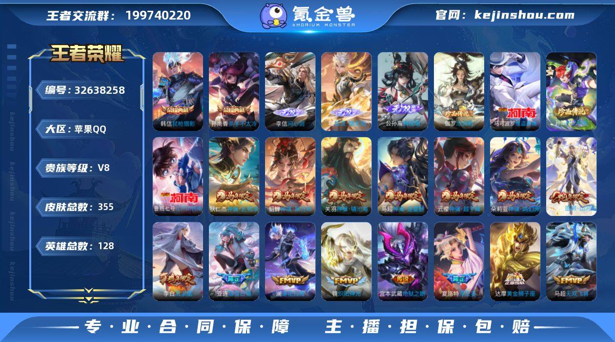 【939329】[17875071]V8 2典藏 3无双 4珍品传说 28传说 128英雄 355皮肤 可修改实名 女号 【英雄全皮】敖隐全皮,空空儿全皮,孙权全皮,蚩奼全皮,夏洛特全皮,大禹全皮 【稀有英雄】敖隐(小龙人),大司命,嬴政(始皇帝),韩信(韩跳跳),夏洛特(夏师傅),艾琳,橘右京(橘子),娜可露露(鸟人),不知火舞,赵云,金蝉(唐僧),戈娅 【荣耀水晶】弑枪猎影(韩信典藏),杀手不太冷 【无双皮】问心剑,器灵·螭龙剑,离恨烟(公孙离无双) 【珍品传说】沧流箭,江户川柯南,怪盗基德,时之奇旅-孙策 【传说皮】神骥·聚万邦,神骥·镇沧海,神骥·逐星野,神骥·越千峰,神骥·鸣幻洲,神骥·赴朔漠,典韦战鼓燎原,落雪白狼,琥珀纪元铠,幻光神枪,千劫归真,黄金狮子座,仲夏夜之梦(大飞蛾),地狱之眼,久胜战神,炽阳神光,无双飞将,时之恋人-刘备(电焊工),末日机甲-孙策,浮生妄,灼幽烈阳,澜逐花归海 【珍宝阁皮】妄想食味,万物之道,优雅恋人,玩趣恶龙 【赛季/战令皮】噬灭天穹(s37),古海寻踪(s33),星界游侠,海盐诗旅(s30),擒涛扼浪(s31),潮玩骑兵,奇幻香踪,探海日志(s32),顽趣-梦奇,剑破天穹(s35),天穹祈灯(s34),青焰无极,苍威无极,天穹之誓(s36),蔡文姬夏日便利店,虞姬夏日便利店,暖冬·兔眠,御銮(s16),朔风刀(s17),混沌棋(s18...