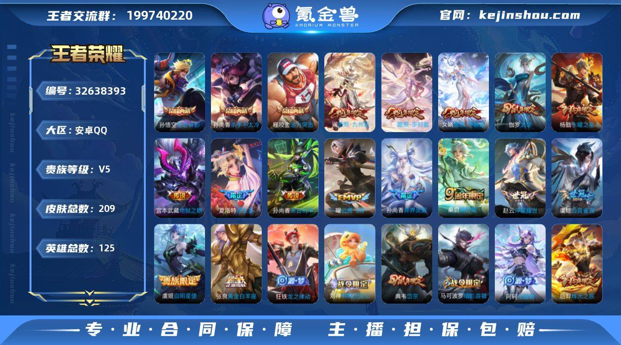 安卓Q-V5-最强王者段位-125英雄-209皮肤-3典藏皮肤-15传说-62史诗 【荣耀典藏】:孙悟空全息碎影,孙尚香杀手不太冷,程咬金活力突击 【传说皮肤】:女娲愿照千秋盛,澜愿照九州拓,虞姬愿照岁时盈,桑启鸣野蒿,夏洛特浮生妄,孙尚香异界灵契,赵云淬星耀世,虞姬启明星使,曜云鹰飞将,伽罗太华,张良黄金白羊座,虞姬云霓雀翎,杨戬永曜之星,孙尚香末日机甲,宫本武藏地狱之眼 【限定皮肤】:姜子牙天穹之誓,狄仁杰阴阳师,赵云皇家上将,赵云引擎之心,妲己时之彼端,孙尚香异界灵契,庄周高山流水,阿轲迷踪丽影,典韦岱宗,马可波罗暗影游猎,狄仁杰魔术师,狄仁杰万华元夜,达摩沙漠行僧,项羽海滩派对,老夫子醍醐杖,程咬金演武夺筹,刘邦夺宝奇兵,兰陵王金庭之子,后羿辉光之辰,后羿如梦令,后羿圣弓游侠,李元芳银河之约,虞姬启明星使,钟馗驱傩正仪,杨戬永曜之星,干将莫邪真爱魔法,鬼谷子原初探秘者,苏烈千军破阵,百里玄策原初追逐者,弈星混沌棋,沈梦溪星空之诺,明世隐疑决卦,裴擒虎李小龙,伽罗太华,嫦娥拒霜思,桑启海盐诗旅,夏洛特浮生妄,姬小满妄想食味,沈梦溪龙舞盛年,李元芳蔬乡物语,刘邦剑破天穹 【年限皮肤】:杨戬永曜之星,后羿辉...