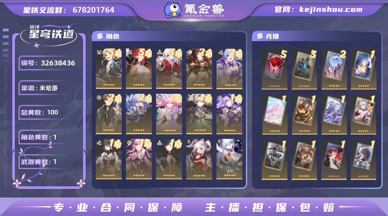 总黄数: 100 五星光锥数: 1 五星角色数: 1 开拓等级: 70 开拓者性别: 女 5命金色角色: 5命彦卿 3命金色角色: 3命姬子,3命克拉拉 2命金色角色: 2命白露,2命瓦尔特,2命知更鸟,2命忘归人 1命金色角色: 1命刃,1命符玄,1命阮•梅,1命黑天鹅,1命流萤,1命昔涟 精5武器: 精5记一位星神的陨落 精3武器: 精3孤独的疗愈 精2武器: 精2记忆永不落幕 精1武器: 精1时节不居,精1但战斗还未结束,精1无可取代的东西,精1银河铁道之夜,精1记忆的质料,精1镜中故我,精1行于流逝的岸,精1夜色流光溢彩,精1不息的演算,精1让告别,更美一些,精1理想燃烧的地狱,精1爱如此刻永恒,精1当她决定看见 亮点: 【xt112】等级:70/总黄数:100/女主/角色黄数:57火花,爻光,昔涟,长夜月,Archer,Saber,赛飞儿,风堇,那刻夏,遐蝶,缇宝,大黑塔,忘归人,灵砂,流萤,知更鸟,黄泉,花火,黑天鹅,真理医生,阮•梅,托帕&账账,符玄,刃,白露,彦卿,克拉拉,杰帕德,布洛妮娅,瓦尔特,姬子,当她决定看见,爱如此刻永恒,理想燃烧的地狱,让告别,更美一些,记忆永不落幕,不息的演算,夜色流光溢彩,行于流逝的岸,镜中故我,孤独的疗愈,时节不居,但战斗还未结束,银河铁道之夜,无可取代的东西,记忆的质料,记一位星神的陨落,5命彦卿,3命克拉拉,3命姬...