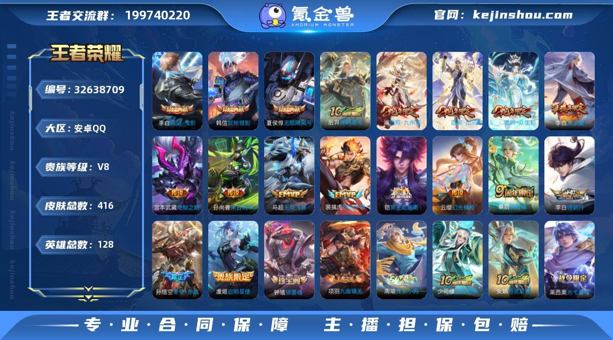 0AQ2C2可二次407皮肤水晶3传说15优质限定23 qq钱包已注销 信用分合格 水晶皮肤:无限飓风号,鸣剑·曳影,弑枪猎影, 新传说限定:愿照·山河定,祥瑞亨通,愿照·九州拓,愿照·众生和, 传说限定:凤求凰,零号·赤焰,神树通天,启明星使, 新传说皮肤:幻光神枪, 传说皮肤:铠冥王哈迪斯,末日机甲-孙尚香,无双飞将,地狱之眼,诗剑行,鸣野蒿, 新史诗限定:器灵·浮梦炉,万灵启世,涂山容容, 史诗限定:引擎之心,谪仙醉月,飞衡,傲雪梅枪,至尊宝,孙行者,雪夜绮愿(周瑜),冰霜恋舞曲,山海·玄木吟,玉兔公主,逐梦之影,天狼狩猎者, 新史诗皮肤:苍鳞隐世,灵蛊蚀心,百相守梦-黄忠, 优质史诗皮肤:天秀·启明,永昼,晚萤,修罗,赏金猎手,魅语,诗语江南,怒海争锋, 周年皮肤:李小龙,江河有灵,游园惊梦,遇见飞天,梁祝,鹤鸣心笺,神树通天,高山流水,五谷丰年, 珍宝阁:妄想食味,玩趣恶龙,女武神, 史诗皮肤:地狱岩魂,星夜王子,圣诞狂欢,末日机甲-吕布,无心,乘风破浪,幽灵船长,苍穹之光,功夫厨神,德古拉伯爵,水晶猎龙者,心灵战警,猫狗日记-孙策,未来纪元-赵云,暗夜猫娘,节奏热浪,鬼剑武藏,千年之狐,紫霞仙子,白龙吟,暗隐猎兽者,美猴王,黎明之约,曙光守护者,原初追逐者,纤云弄巧,缤纷独角兽,金属风...