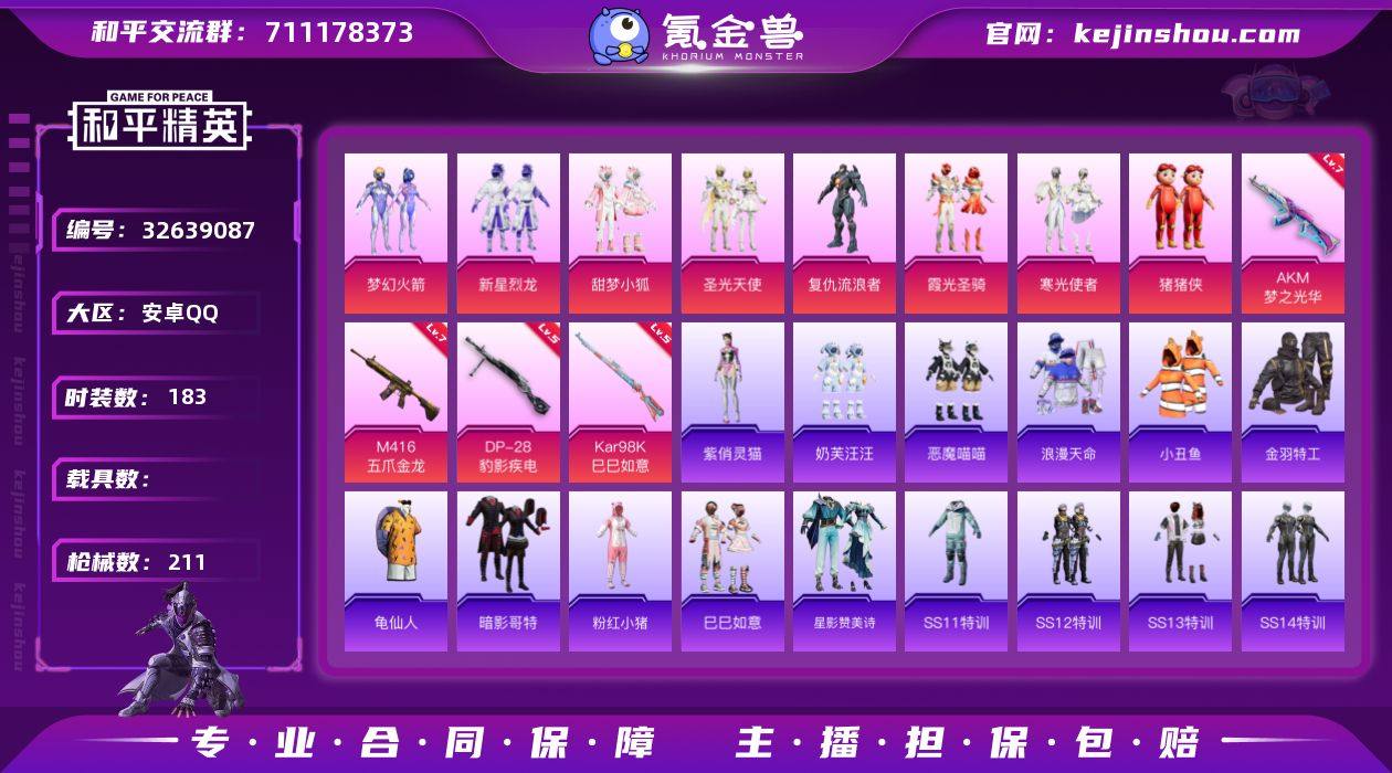 【939445】安卓【男神号 粉装-梦幻火箭,套装-浪漫天命,套装-金羽特工,套装-暗影哥特,AKM-梦之光华(七级),M416-五爪金龙(七级)】 手Q-8粉装-4特效枪-0载具-1粉色飞行器-68491热力值-14王牌印记-183套装-211枪皮 【热门品类】:粉装-梦幻火箭,套装-浪漫天命,套装-小丑鱼,套装-金羽特工,套装-龟仙人,套装-暗影哥特,套装-粉红小猪 【粉色套装】:粉装-梦幻火箭,粉装-新星烈龙,粉装-甜梦小狐,粉装-圣光天使,角色-复仇流浪者,粉装-霞光圣骑,粉装-寒光使者,玩偶服-猪猪侠 【粉色枪皮等级】:AKM-梦之光华(七级),M416-五爪金龙(七级),Kar98K-巳巳如意(五级),DP-28-豹影疾电(五级) 【粉色枪皮】:AKM-梦之光华,M416-五爪金龙,Kar98K-巳巳如意,DP-28-豹影疾电 【粉色飞行器】:甜梦小狐飞行器 【粉色降落伞】:未来战士降落伞,梦幻火箭降落伞,繁花小夜曲降落伞,四圣焕新降落伞,心之恋语降落伞,夏日绵绵冰降落伞,香水柠檬降落伞,筑梦精灵降落伞,甜梦小狐降落伞,圣光天使降落伞,忍者神龟降落伞,荧海星豚降落伞 【稀有套装】:套装-龟仙人,套装-巳巳如意,套装-星影赞美诗,角色-紫俏灵猫 【稀有枪皮】:AKM-四圣焕新,AKM-夜灯,AKM-奇异狩猎者,AKM-...