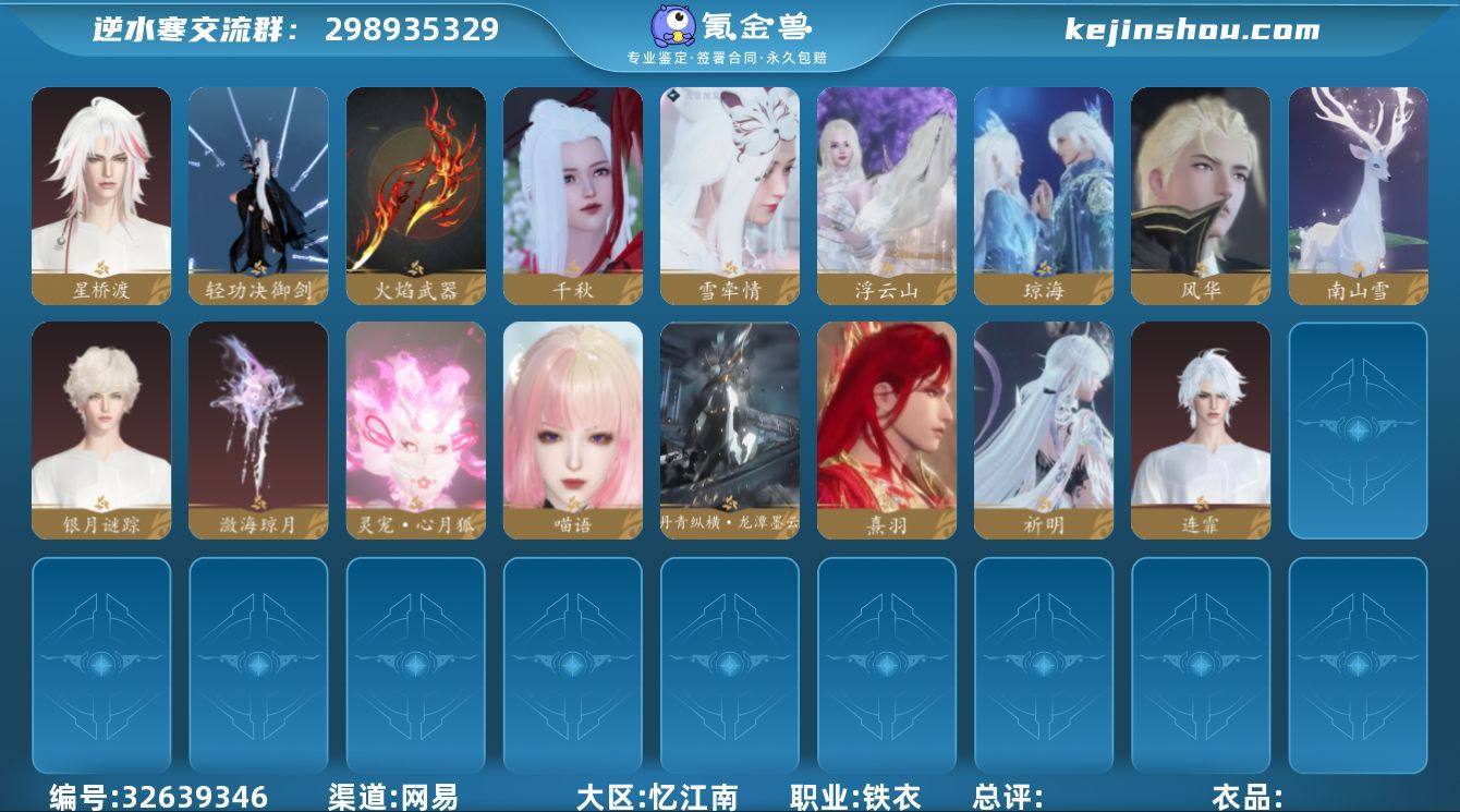 已用天赏石:26 天霓染数量:3 【网易手机账号】 【无换绑冷却】 【铁衣】 【女】 【5级】 【卧看千山】 【互通】 转盘外观1 副本外观2 天赏外观15 天赏祥瑞1 天赏灵宠1 武器环身6 转盘外观:连霏; 副本外观:白夜拂雪,星落月皓,紫宿宸极; 天赏外观:浮云山,星桥渡,雪牵情,银月谜踪,千秋,喵语,祈明,熹羽,风华,琼海,星辰武器,水母武器,火焰武器,轻功诀御剑,丹青纵横·龙潭墨云; 天赏祥瑞:南山雪; 天赏灵宠:灵宠·心月狐; 武器环身:渊墟深影,南枝已谢,振金雷,掌星执辰,剑渡东海,谪仙雷剑;